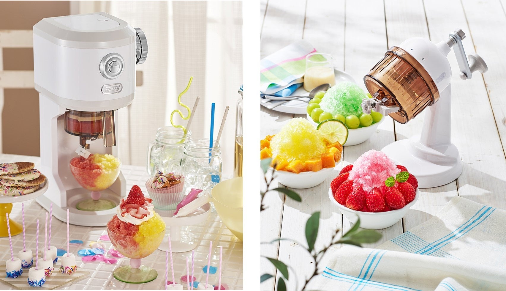 Toffyシリーズで毎年好評のかき氷器は、レトロクラシックなデザインが特長の電動/手動の2タイプ。