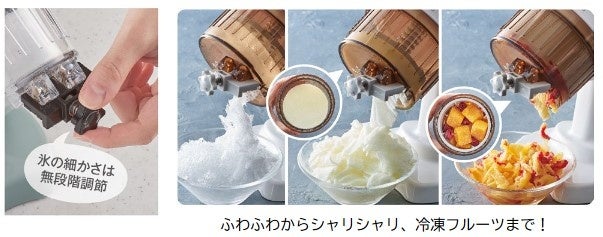 刃の調節レバーで氷の細かさを無段階に調節することができ、ふんわり口どけなめらかなかき氷から、定番のさらさらとしたかき氷まで、お好みの食感のかき氷を作ることができる。