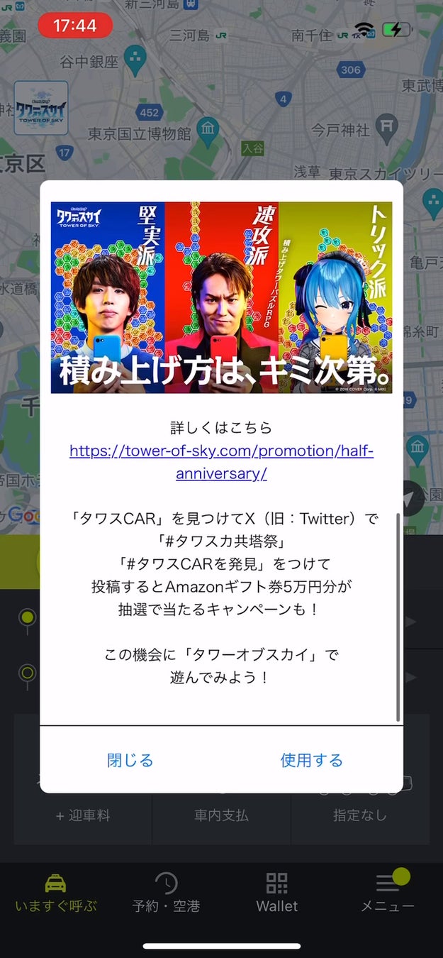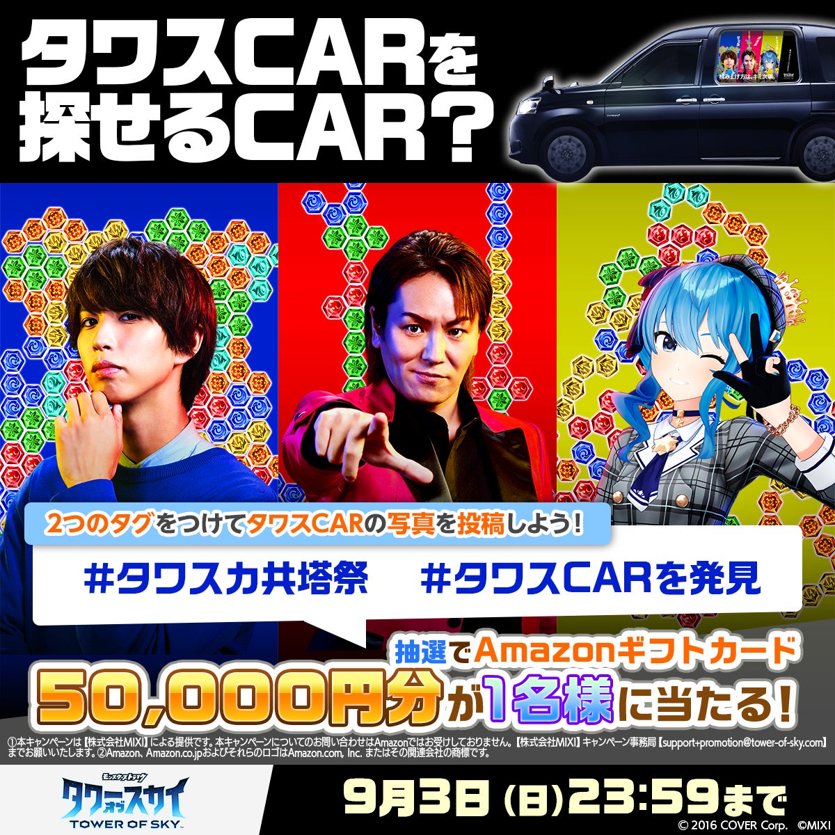 - 株式会社MIXIが「タワーオブスカイ」のハーフアニバーサリーを記念して、コラボレーションタクシー「タワスCAR」を100台限定で登場させる
