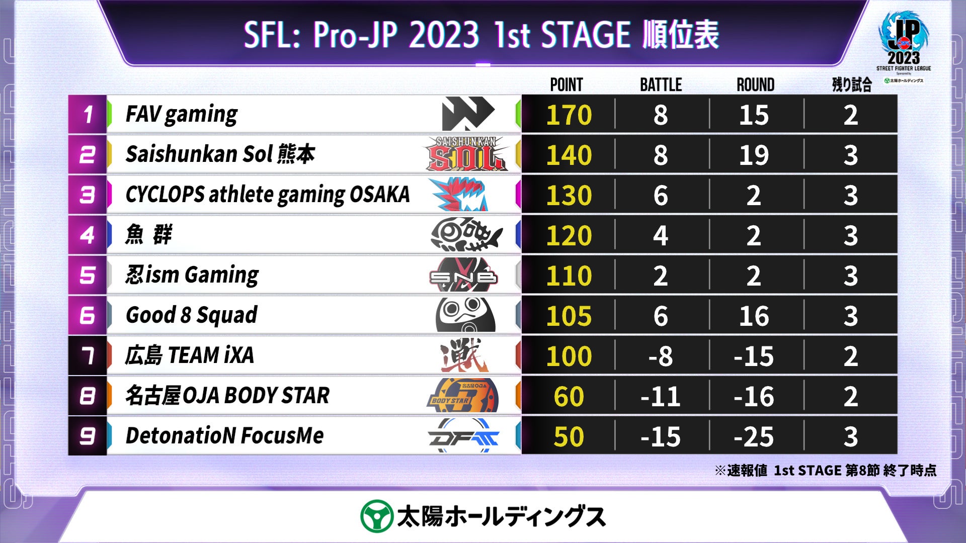 忍ism Gaming、FAV gaming、DetonatioN FocusMe、名古屋OJA BODY STAR、Saishunkan Sol 熊本、広島 TEAM iXA