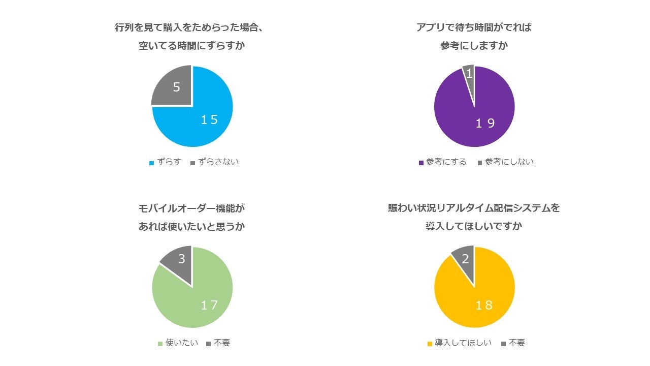 実施結果では、多くの来場者が混雑状況リアルタイム配信に利便性を感じ、待ち時間の回避行動が起こり、行列が短くなる効果があることがわかりました。