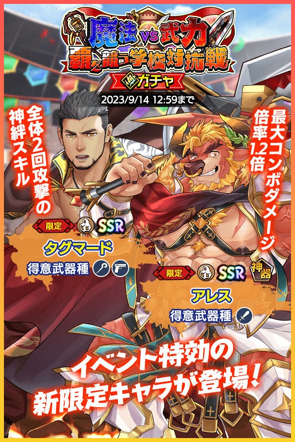 また、期間限定の「魔法VS武力 覇を競う学校対抗戦」ガチャも登場し、SSR魂友「タグマード」とSSR神器「アレス」を入手することができます。
