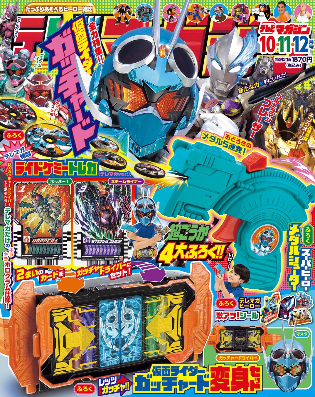 「テレビマガジン 10・11・12月号」では、ヒーロー祭りが開催されます! 9月3日から放送が始まる『仮面ライダーガッチャード』をはじめ、『ウルトラマンブレーザー』や『王様戦隊キングオージャー』など、闘いながら遊べる付録が注目です。