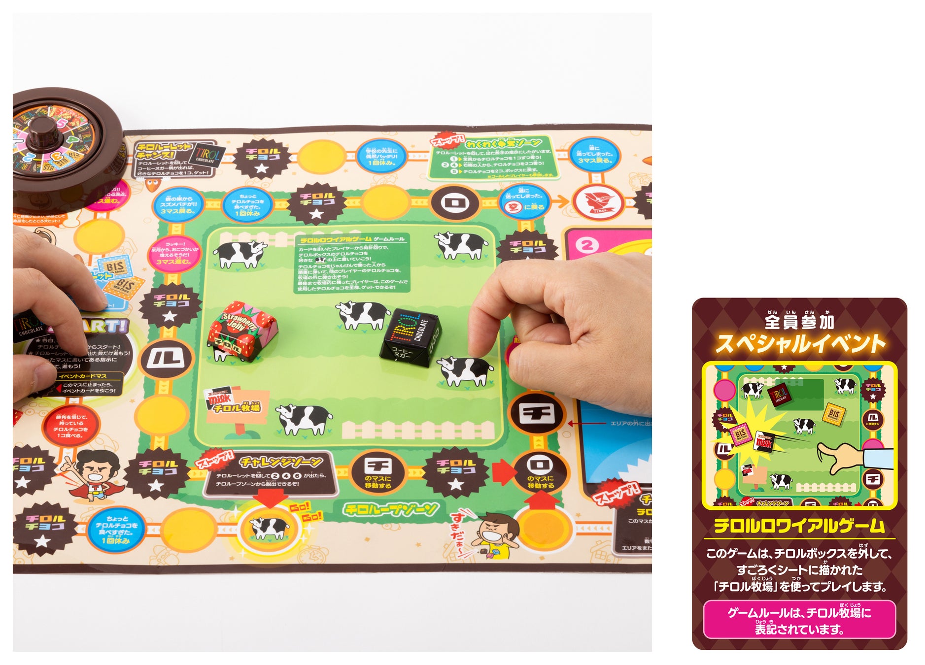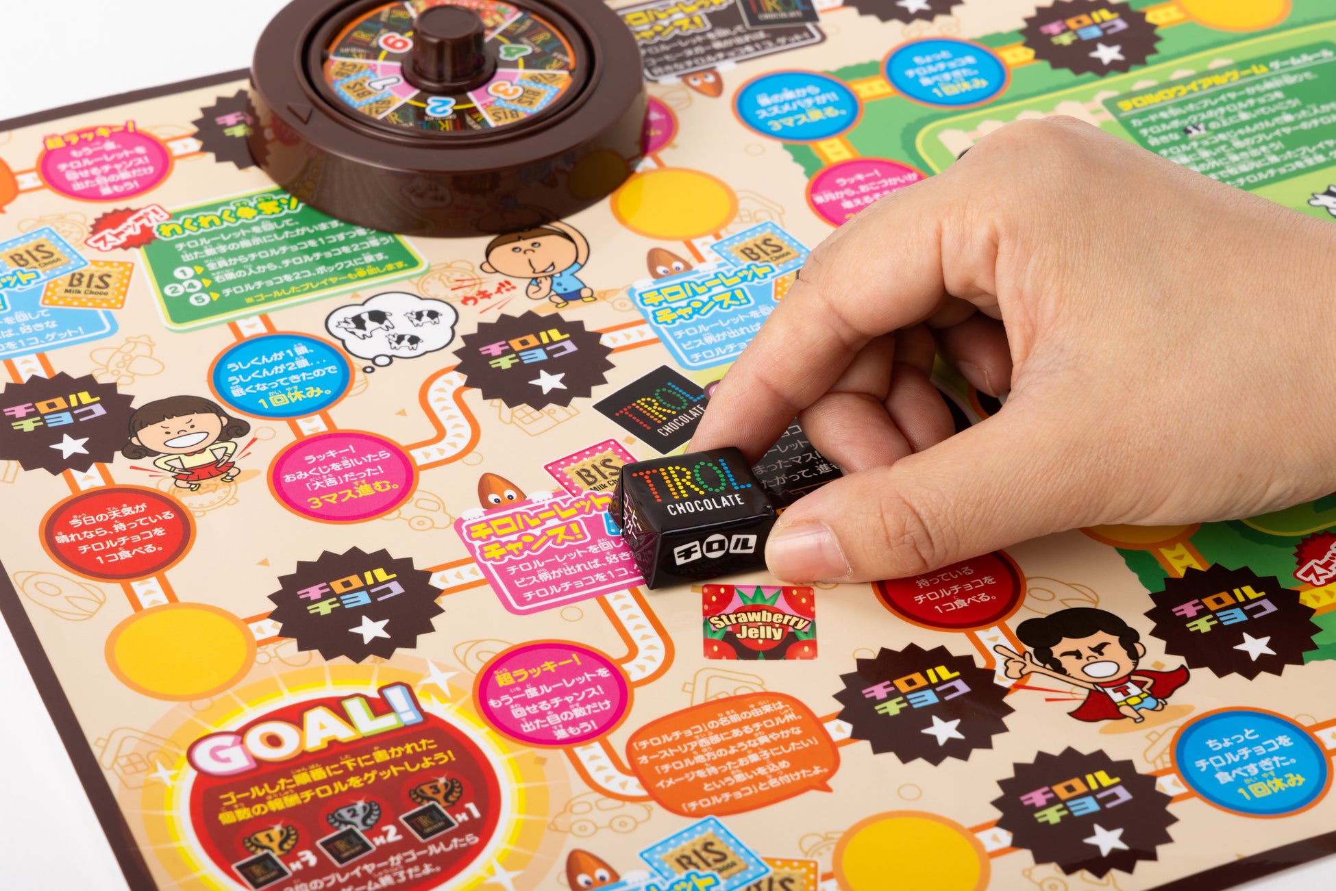 - チロルチョコを集めて自分のコマを進め、最も多くのチロルチョコを持っているプレイヤーが勝利