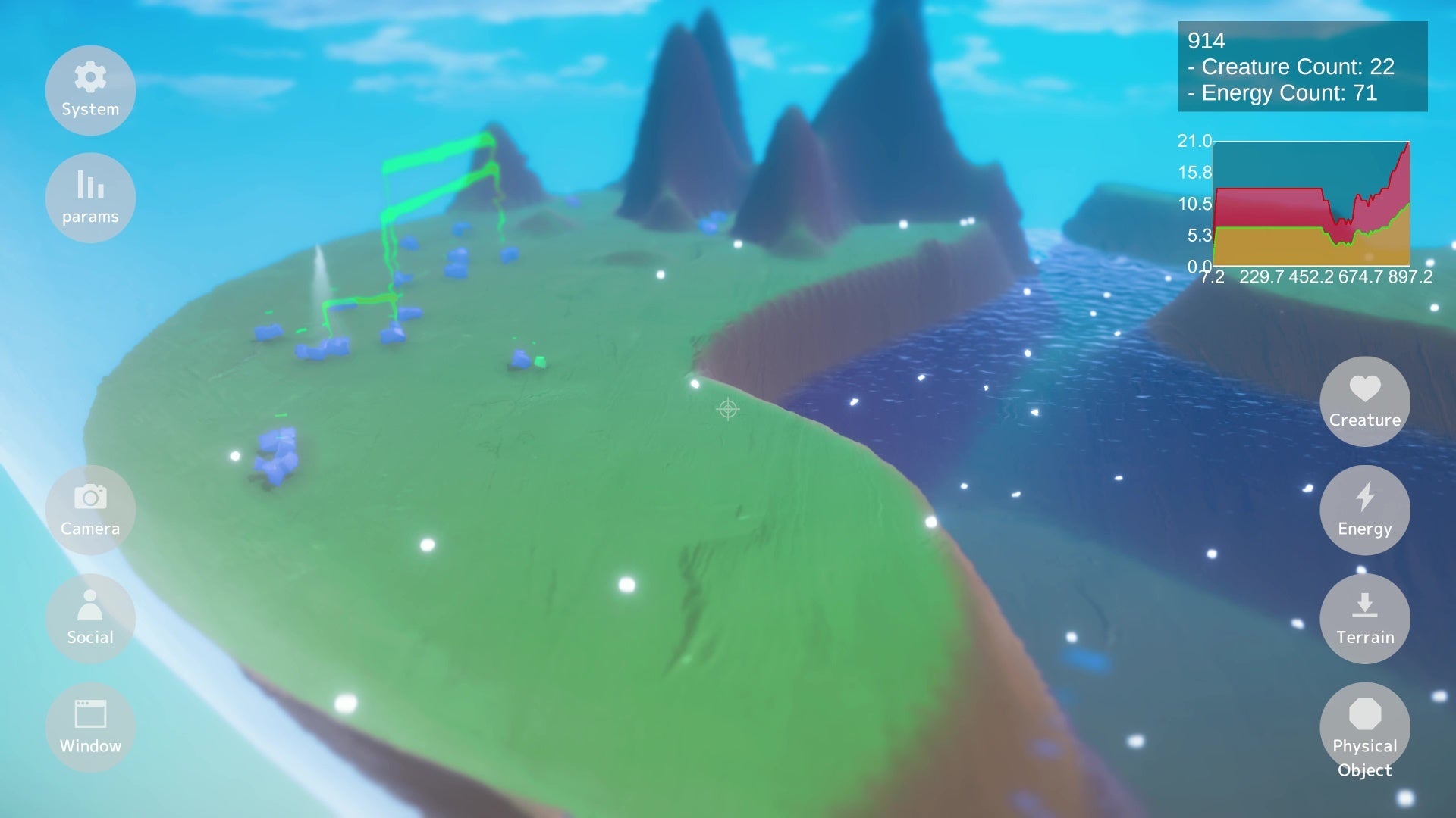 このゲームでは、プレイヤーは創造主として自然を操作し、生物の学習や進化をサポートします。
