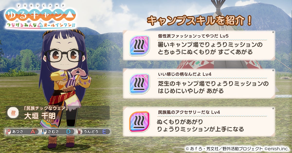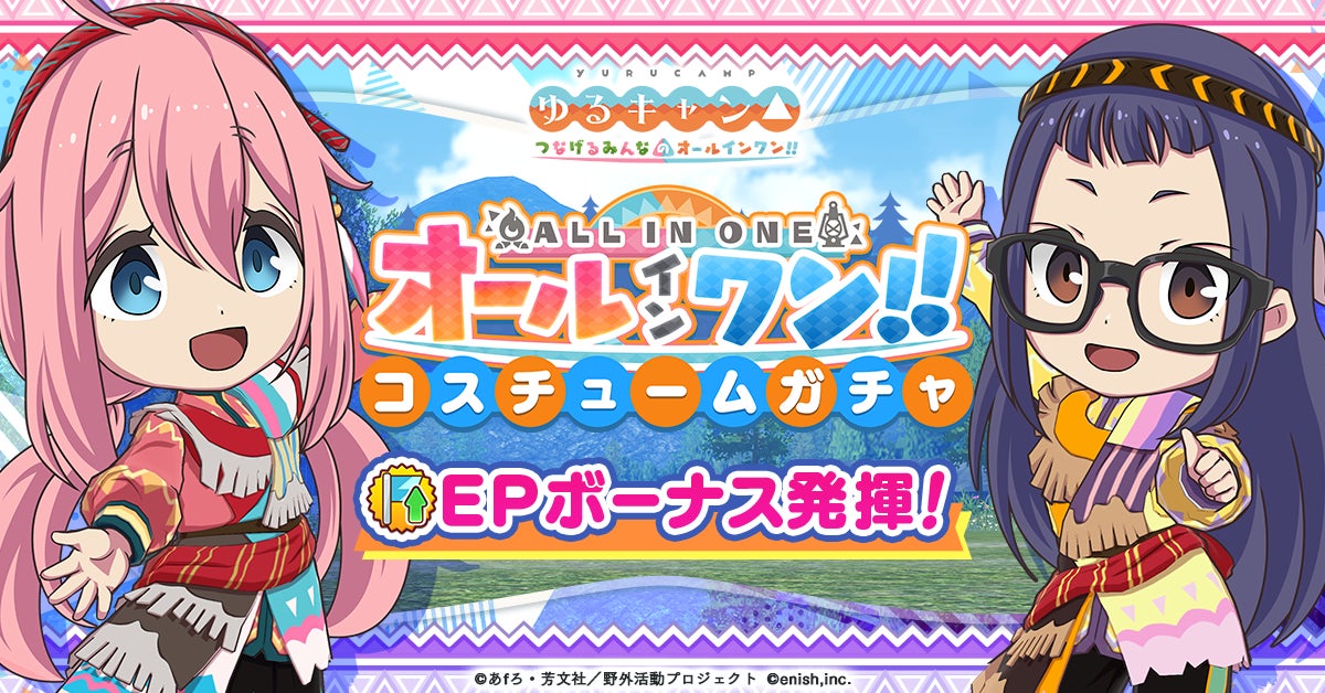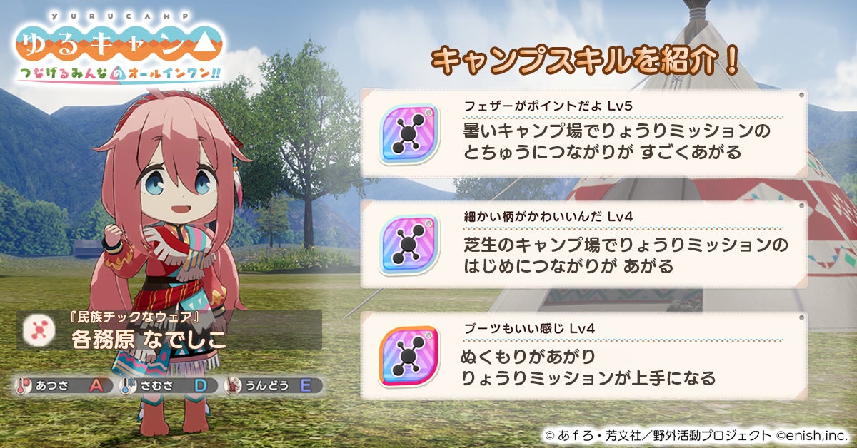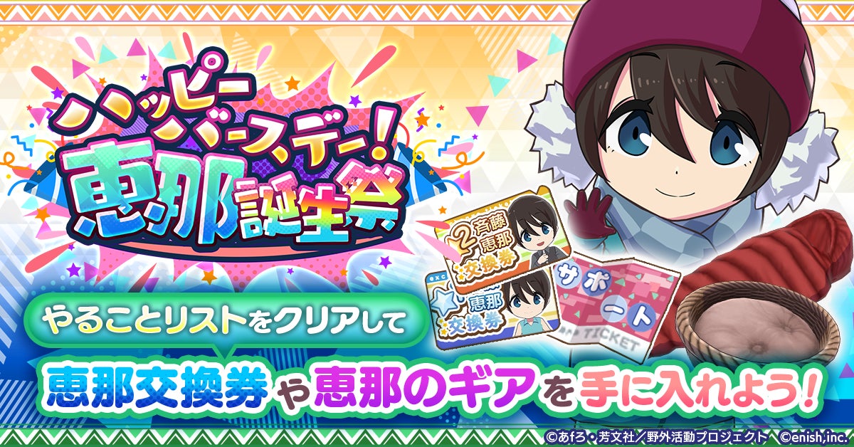 株式会社enishは、TVアニメ『ゆるキャン△』初のオンラインゲーム「ゆるキャン△ つなげるみんなのオールインワン!!」にて、新イベント「野クルトライブ!~ティピーテントとワイルドステーキ~」を開催します。