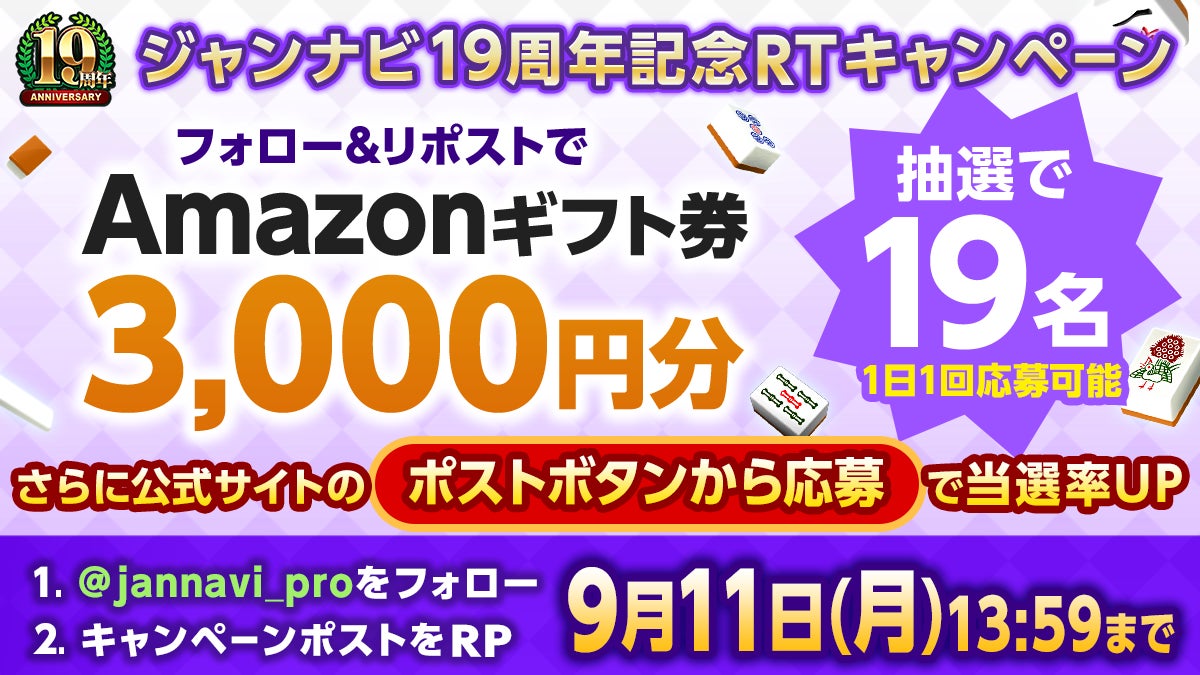 2023年9月2日で19周年を迎えるオンライン麻雀ゲーム「ジャンナビ麻雀オンライン」が、記念キャンペーンを開催します。