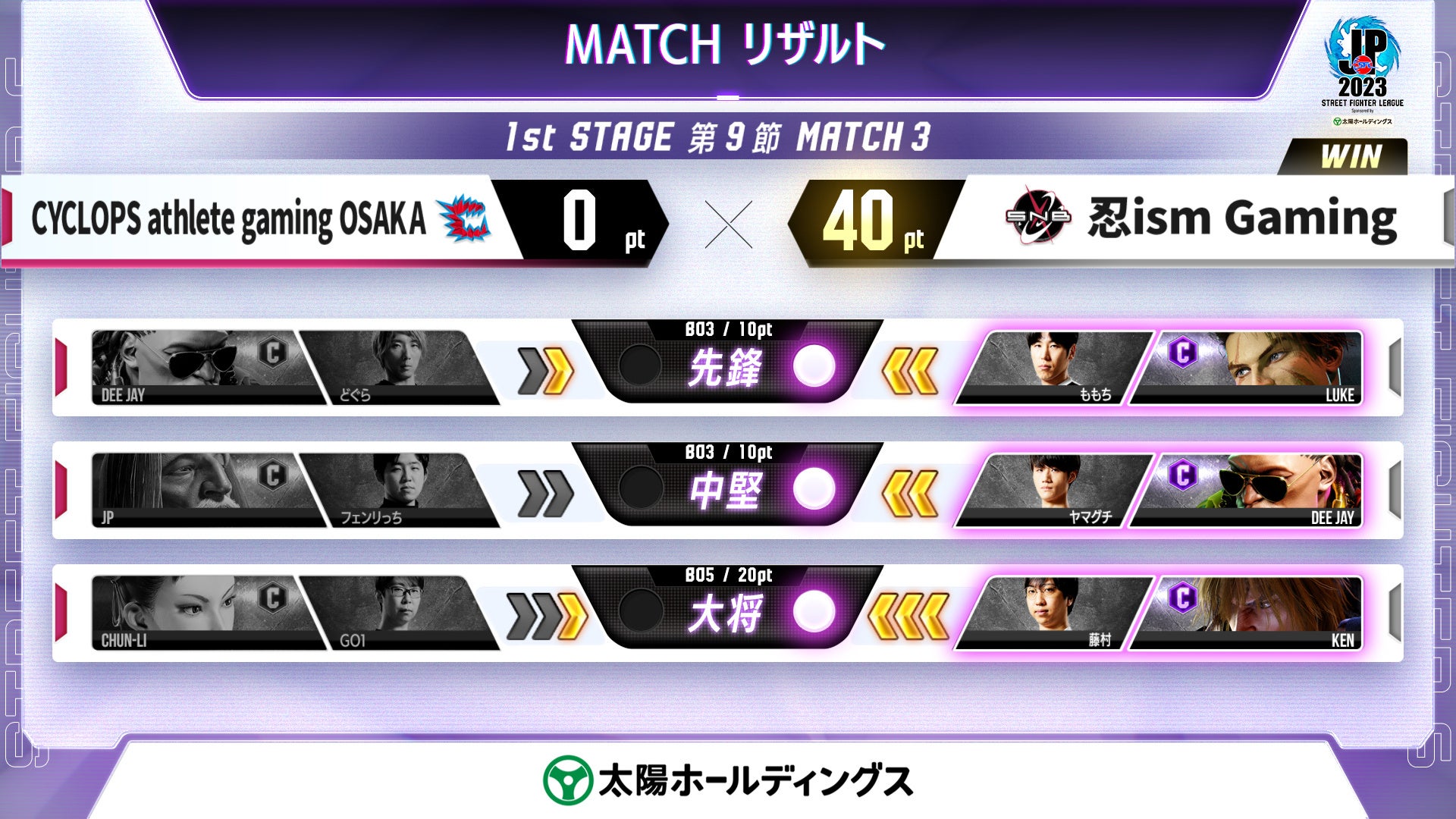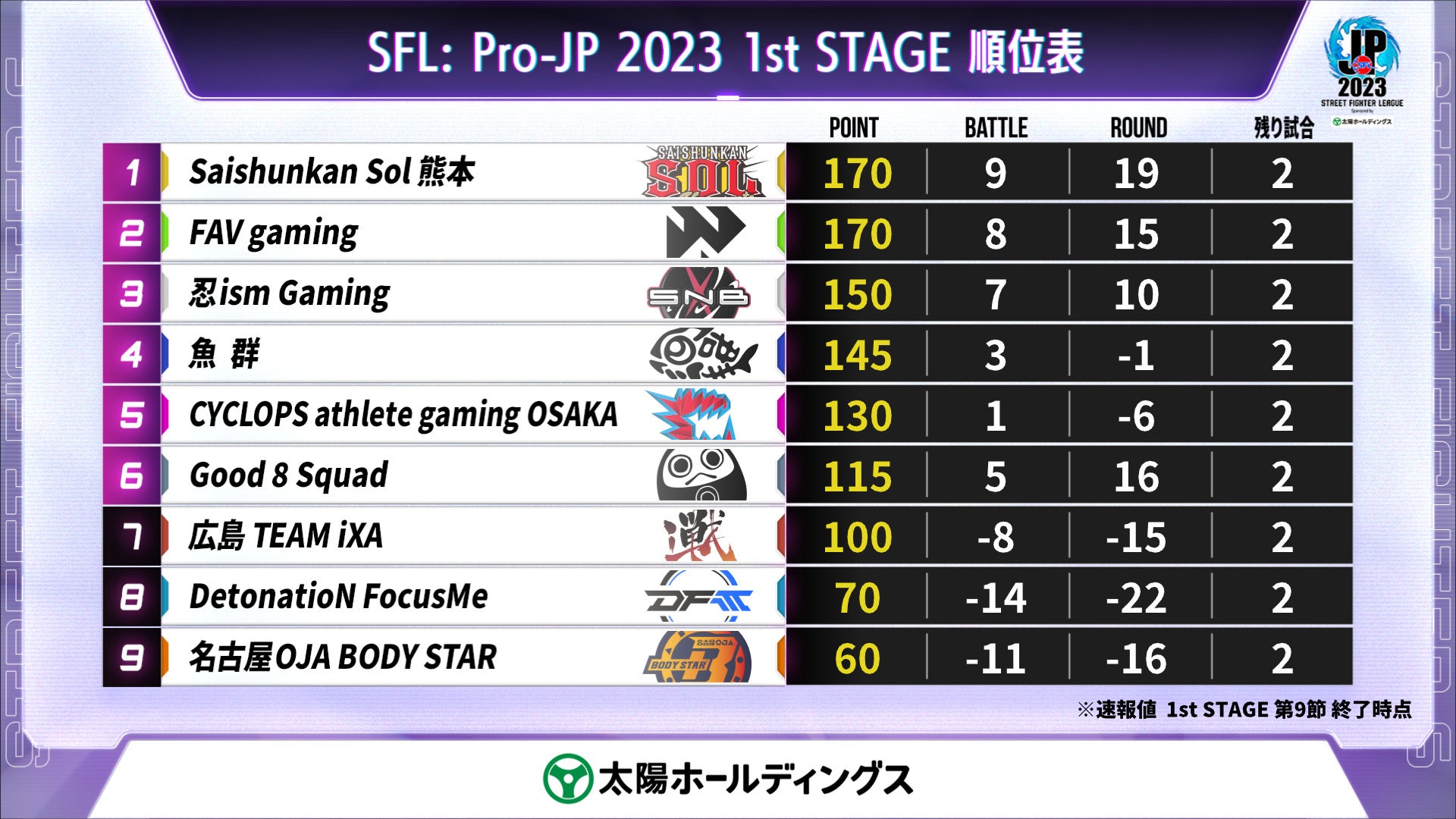 - 「Saishunkan Sol 熊本」や「忍ism Gaming」の勝利が注目されました。