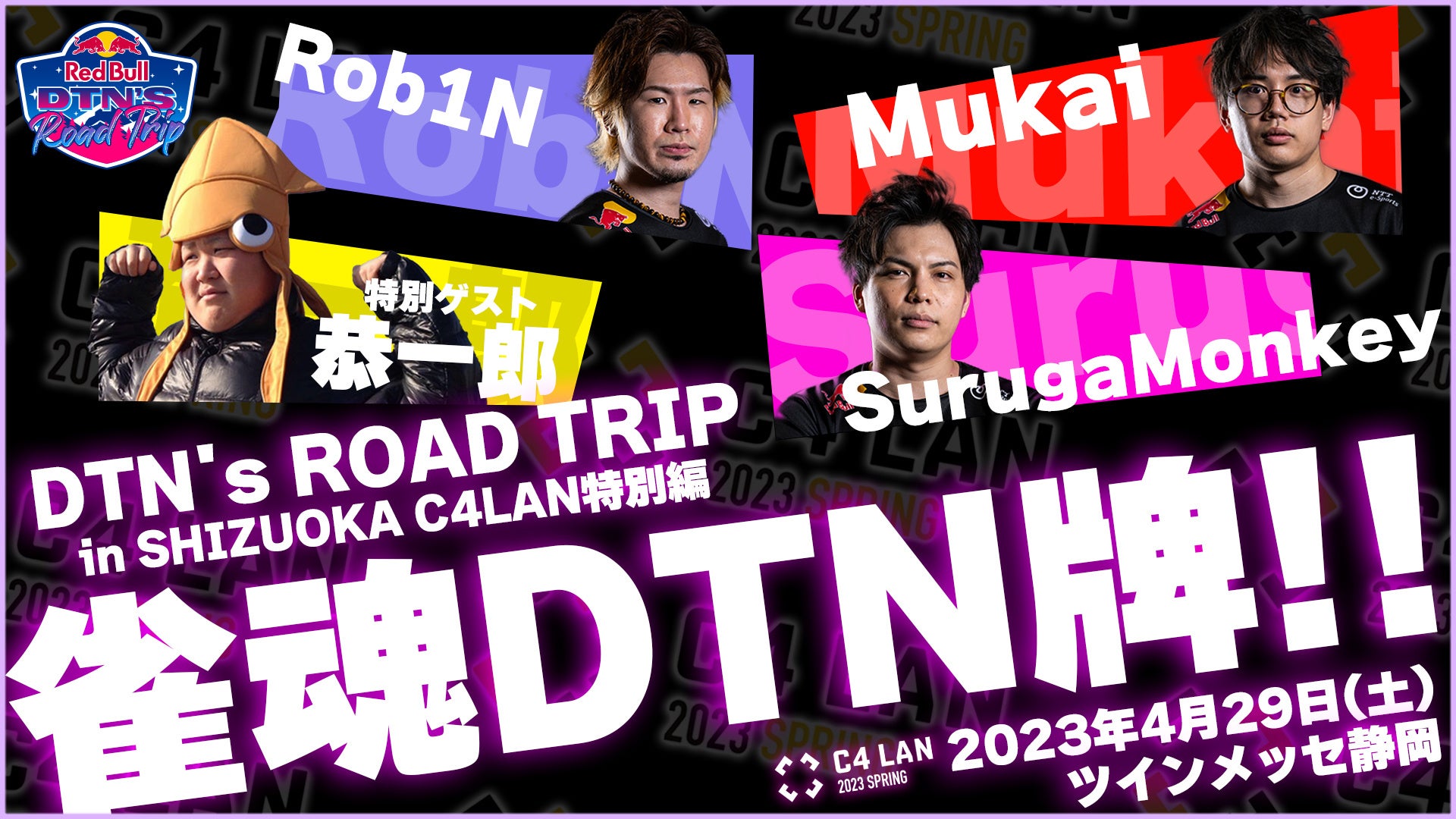2023年4月28日から30日にかけて開催されるゲーム機持ち込み型パーティー「C4 LAN 2023 SPRING」の2日目には、DTN所属の人気ストリーマーRob1N、SurugaMonkey、Mukai、そして特別ゲストのYouTuber恭一郎が参加する「DTN’s ROAD TRIP in SHIZUOKA C4 LAN特別編 雀魂DTN牌」が開催される。