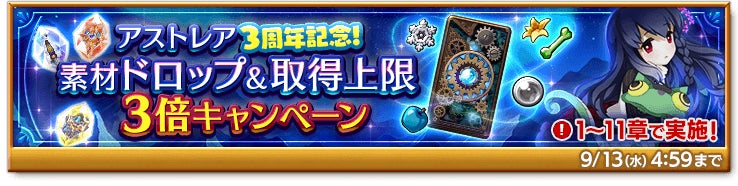 - 実装3周年記念キャンペーン、素材ドロップと取得上限が3倍に