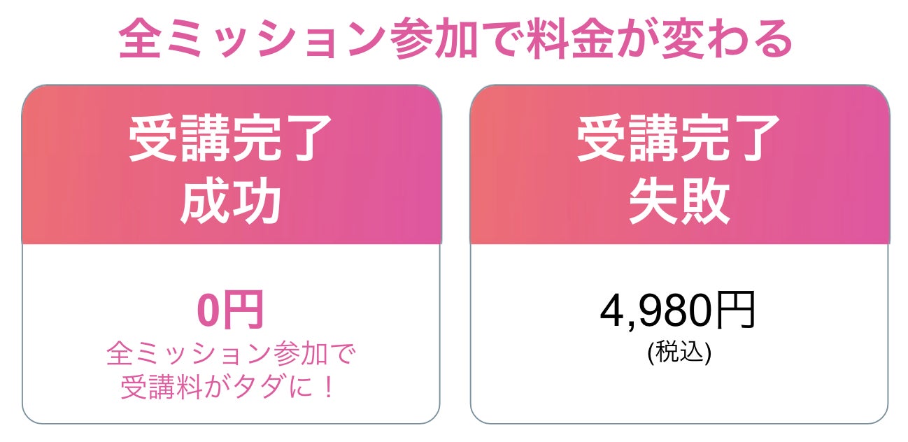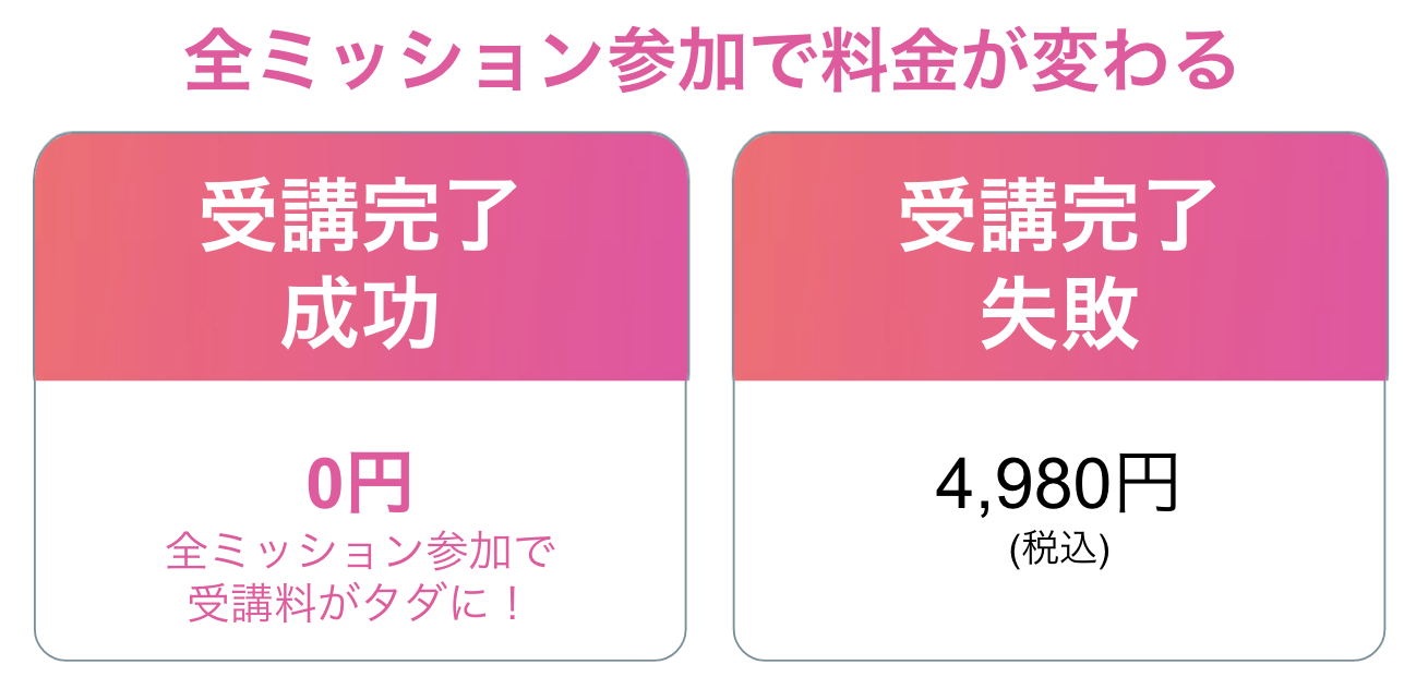 通常4,980円/月ですが、参加前に設定された条件をクリアした場合は”受講料が無料になる”という独自の価格方式を採用しています。