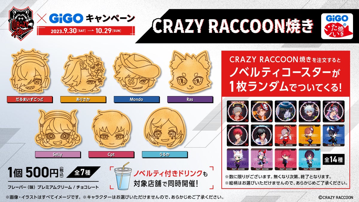 また、GiGOのたい焼きでCrazy Raccoonのメンバーをモチーフにした「CRAZY RACCOON焼き」を販売し、オリジナルコースターをランダムでプレゼントします。