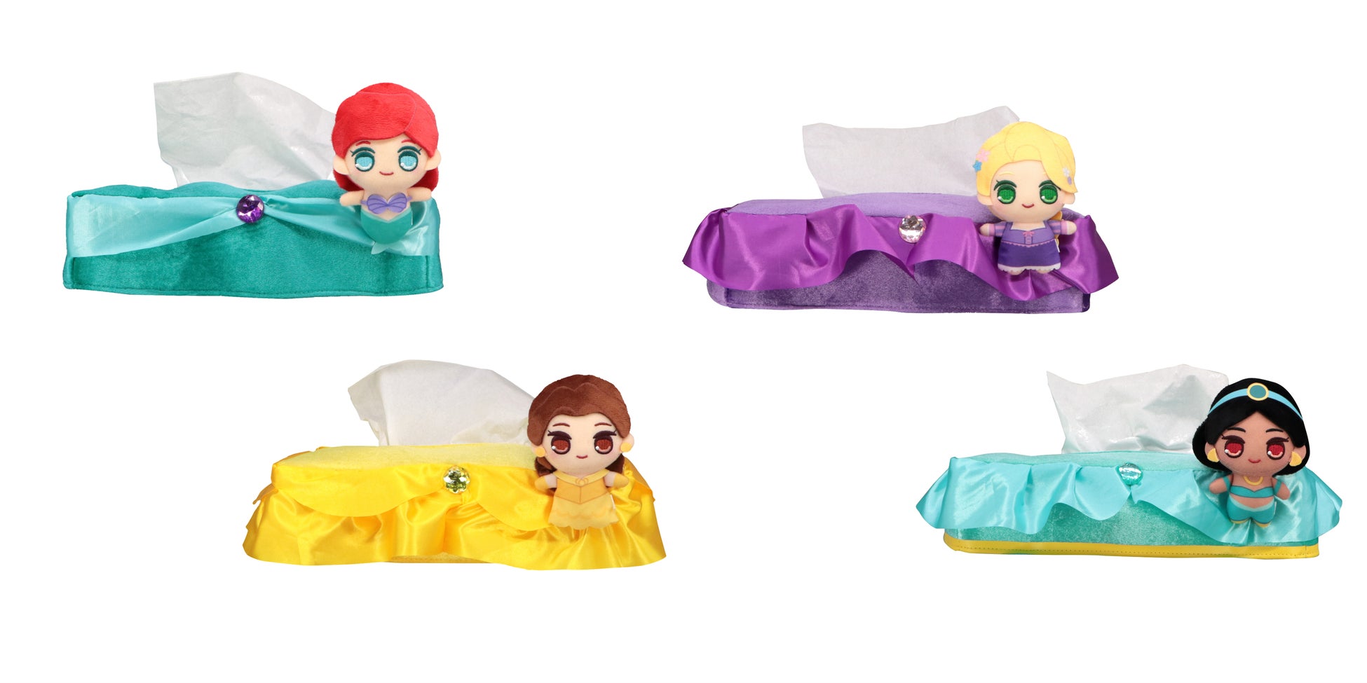 アリエル、ラプンツェル、ベル、ジャスミンの4人のプリンセスがデフォルメスタイルで登場し、マスコットやバスタオル、ティッシュボックスカバー、ぬいぐるみハンガーなどのアイテムがあります。