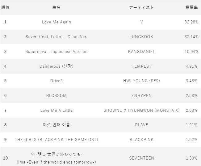 さらに、同アプリの投票機能と連動した日本国内初のラジオ番組「IDOL CHAMP presents POP-K TOP10 Friday」(TOKYO FM)の9月8日放送回では、VのLove Me Againが3週連続で1位を獲得しました。