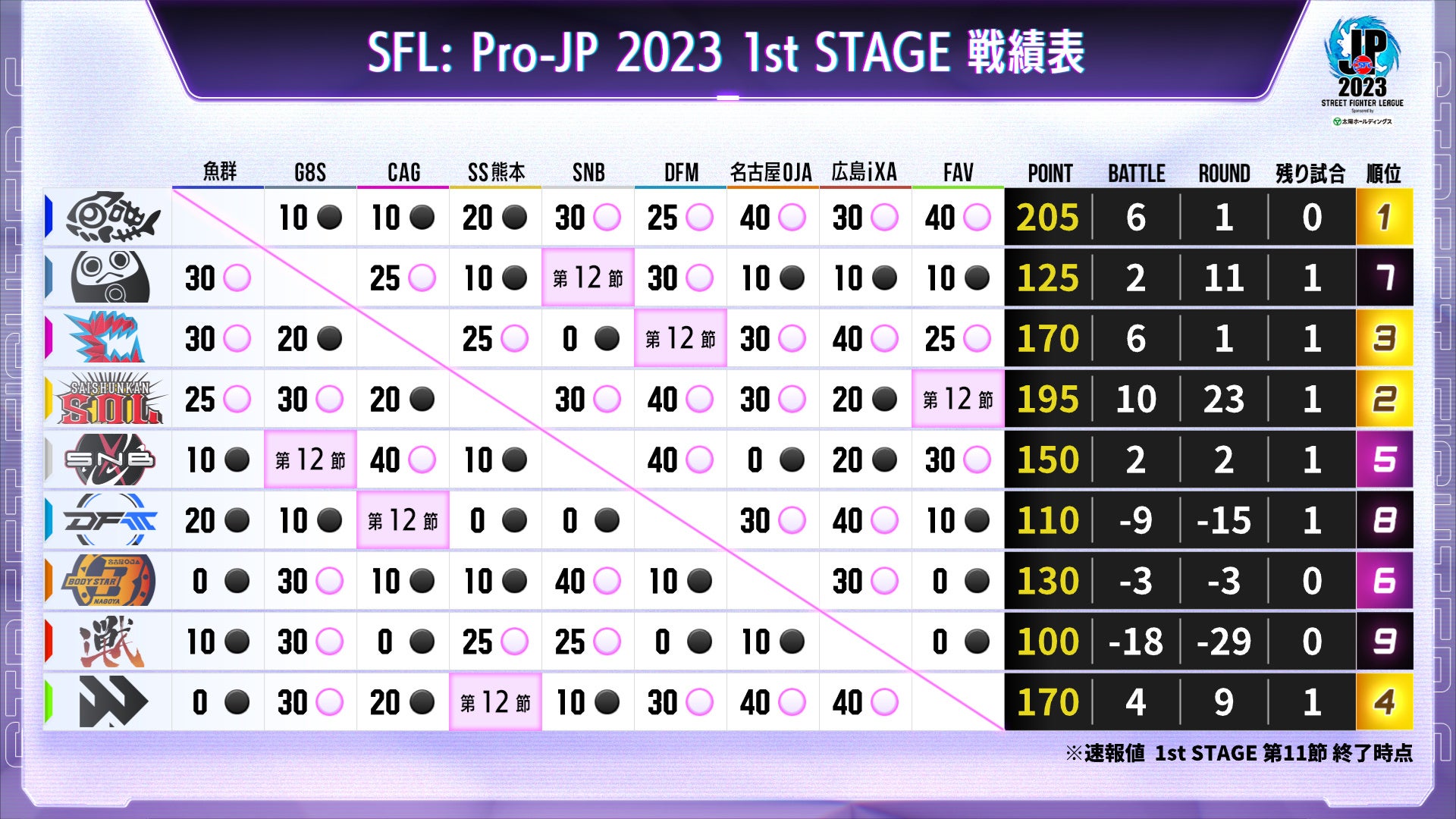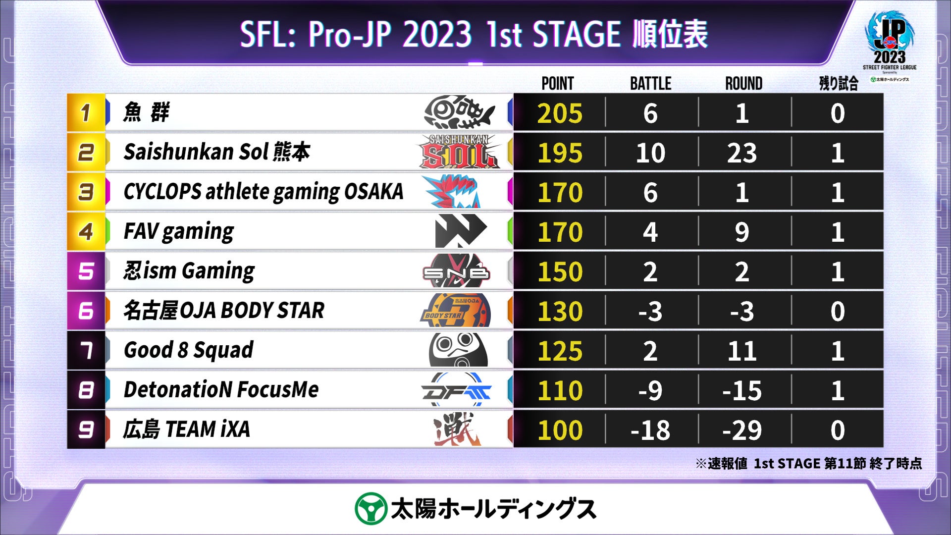 - 広島TEAM iXA、DetonatioN FocusMe、名古屋OJA BODY STAR、忍ism Gaming、魚群、Saishunkan Sol熊本