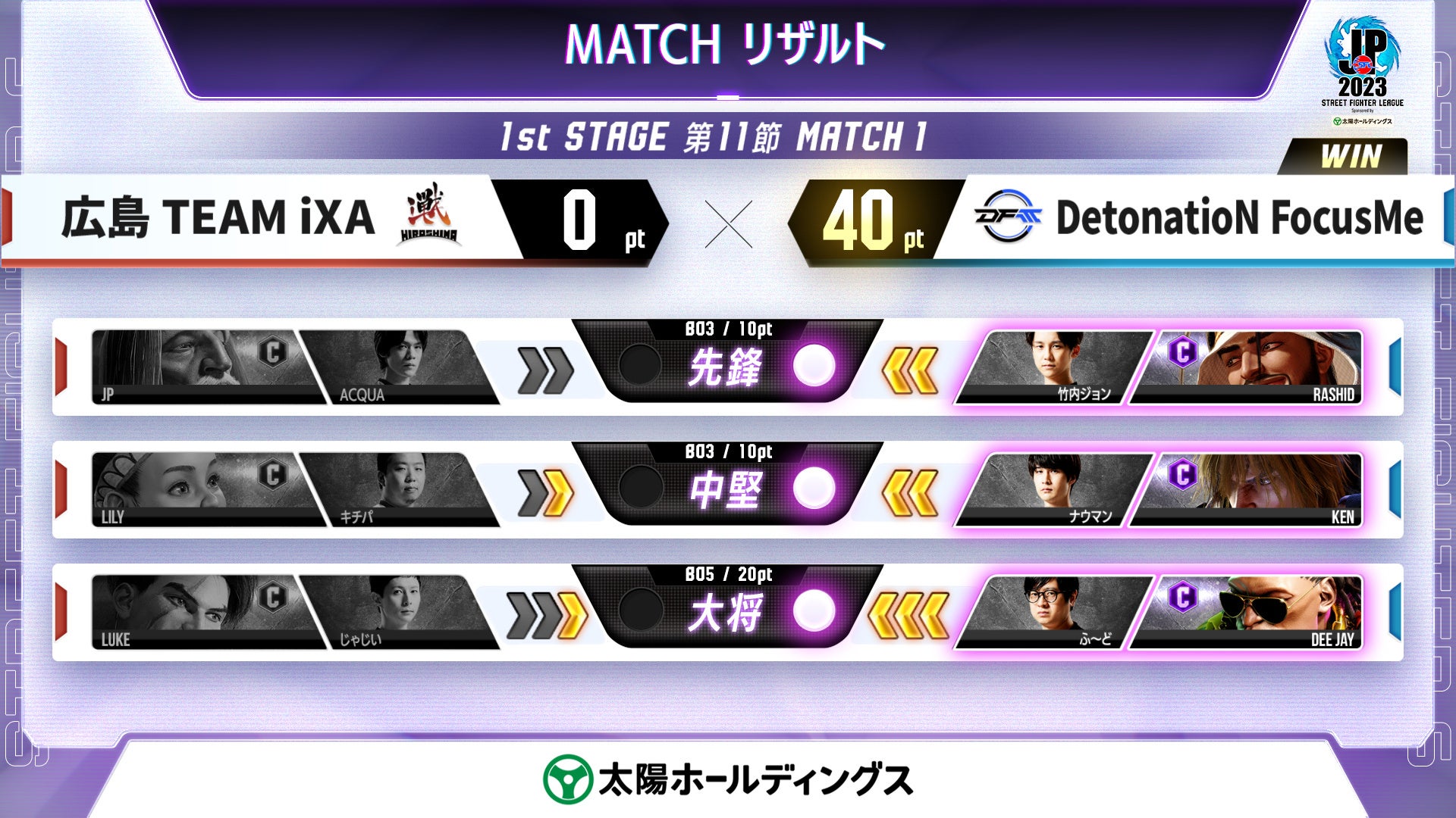 - 広島TEAM iXA vs DetonatioN FocusMeの試合では、竹内ジョン選手がACQUA選手に勝利しました。