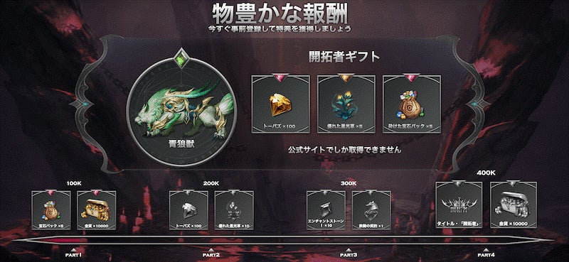 豪華な特典がもらえる事前登録も受付中で、40万人の予約達成で独占タイトル「開拓者」が手に入ります。