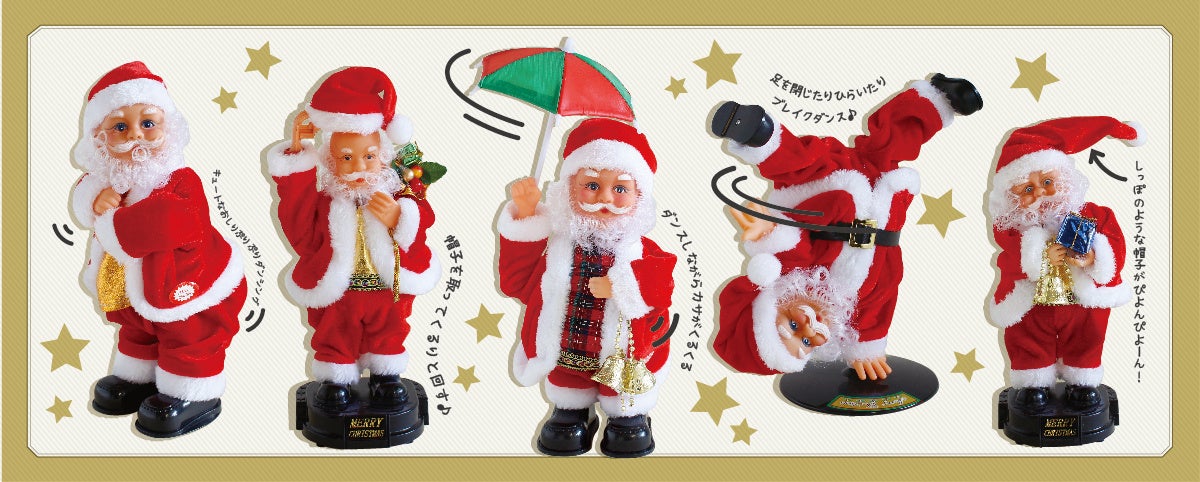今年は新作5型が登場し、それぞれ個性的な動きをするサンタたちが仲間入りしました。