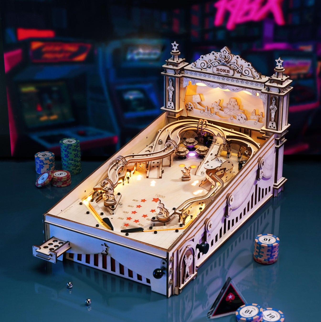 このウッドパズルは、つくる喜びを感じながら作り上げることができ、完成後には実際にピンボールマシンとして楽しむことができます。