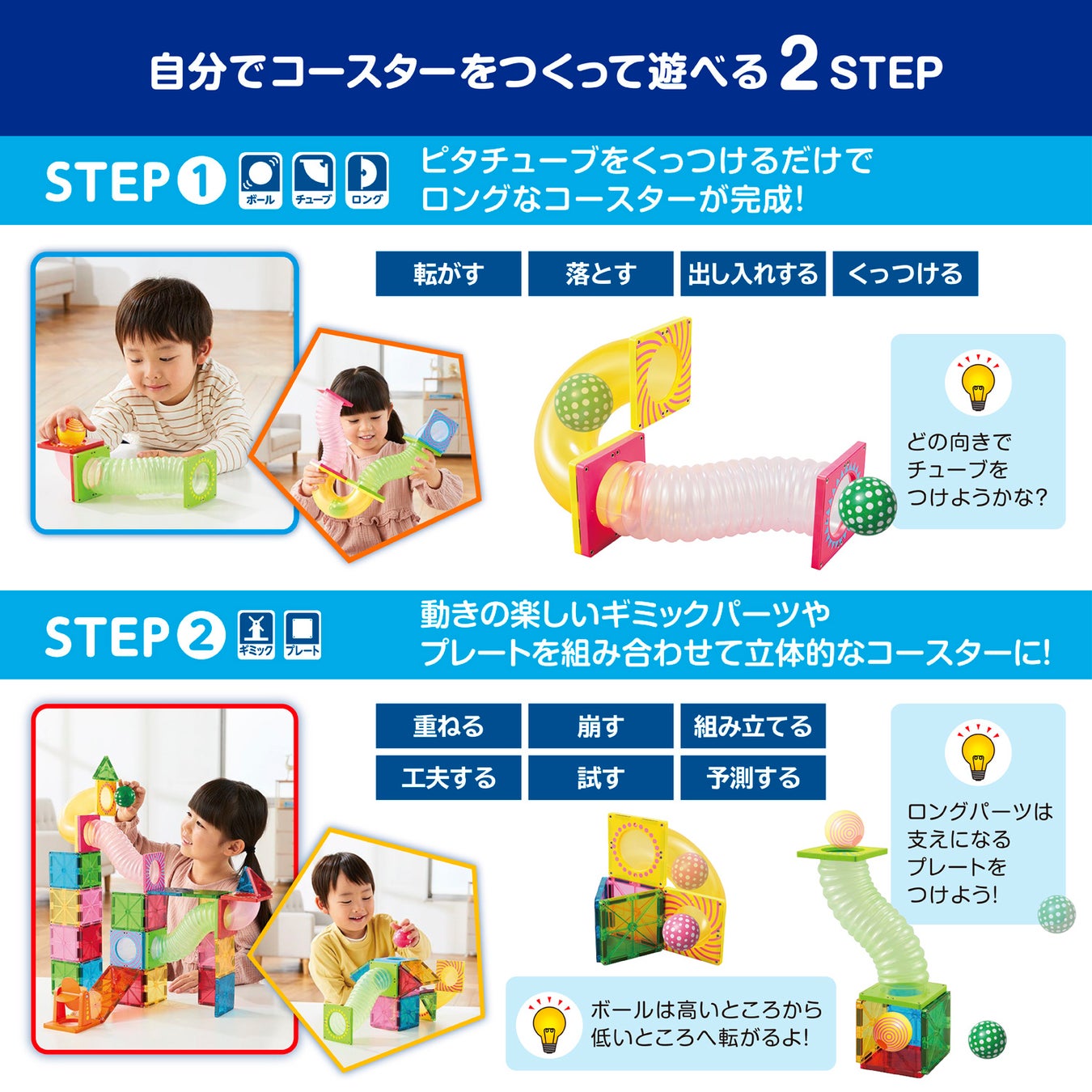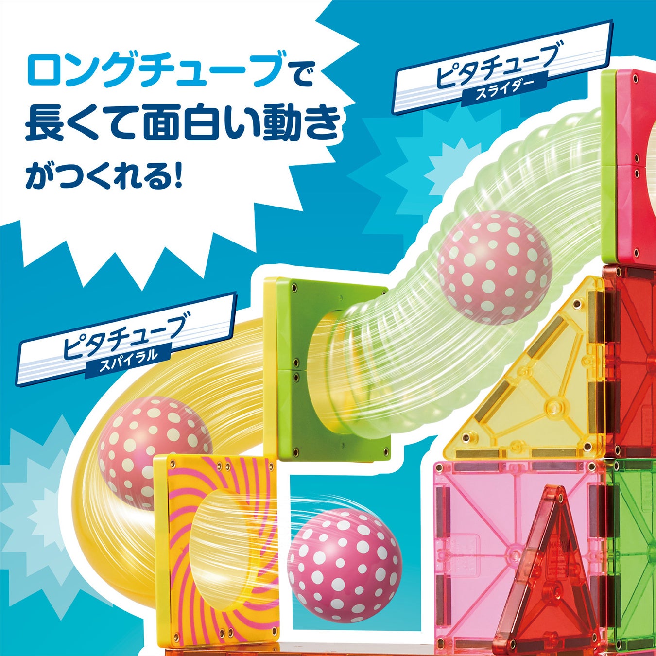 さらに、新パーツ「ピタチューブ2種」を使って様々な形のコースを作ることもできます。