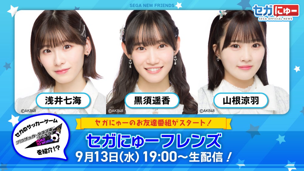第1回では、AKB48の浅井七海さん、黒須遥香さん、山根涼羽さんが出演し、『プロサッカークラブをつくろう! ロード・トゥ・ワールド』の魅力や「世界の珍しい甲虫&甲虫王者ムシキング20周年展」の様子を紹介します。