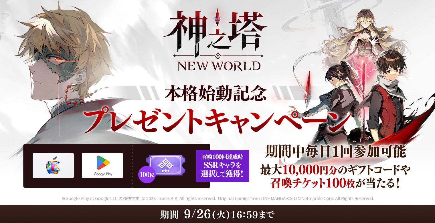 ネットマーブルは、スマートフォン向けの本格アニメーションRPG「神之塔:NEW WORLD」の本格始動を記念して、9月13日(水)から新規プレイヤーを対象に豪華特典がもらえるキャンペーンを開催します。