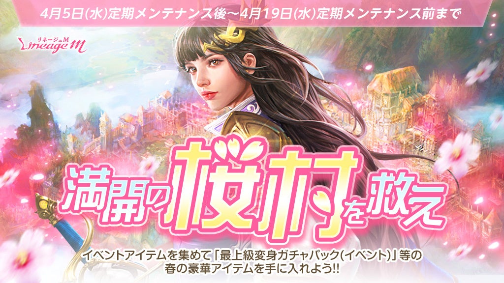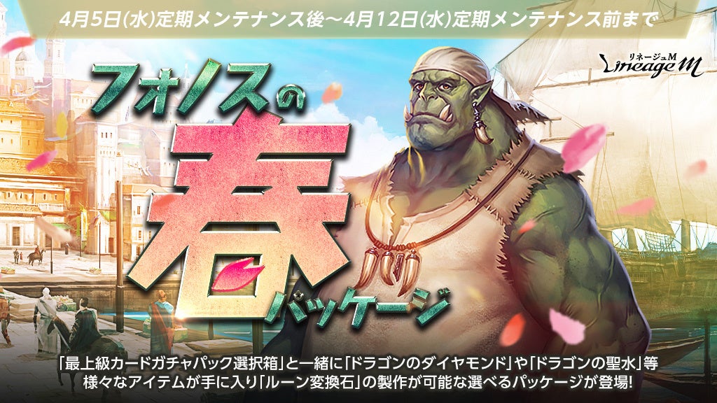 PCオンラインRPG「リネージュ」のモバイル版タイトル『Lineage M(以下、リネージュM)』のサービス、運営をしているエヌ・シー・ジャパン株式会社(東京都港区、代表取締役:金 澤憲(キム テクホン) 以下、エヌシージャパン)は、2023年4月5日(水)に、オーク集落アップデート「フォノスオークの戦闘基地」の追加、お花見イベント「満開の桜村を救え」、「Cherry Gift 2023」の開催、「フォノスの春パッケージ」含む新たなパッケージの登場をお知らせします。