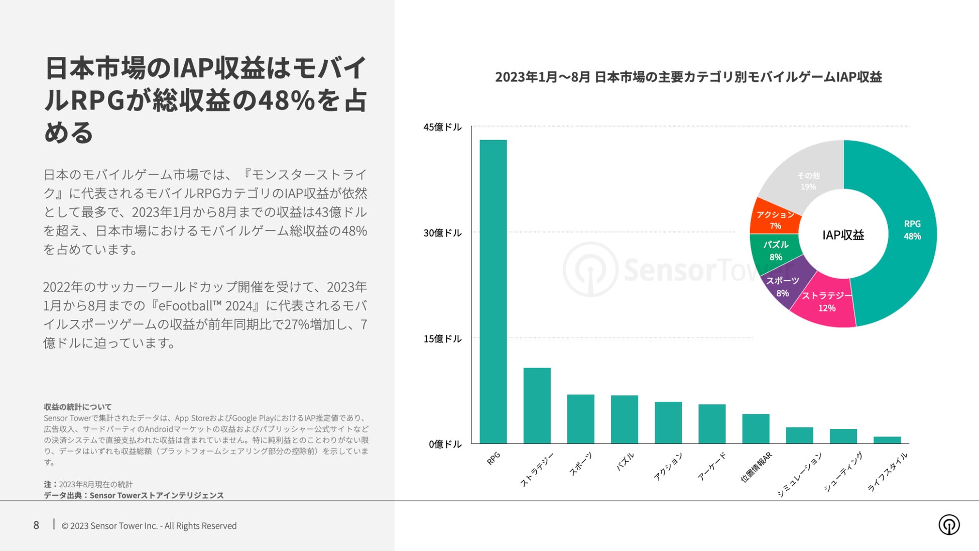 特にモバイルRPGカテゴリのIAP収益が日本市場の総収益の48%を占めており、アドベンチャーや二次元キャラクターをテーマにしたモバイルゲームも人気です。