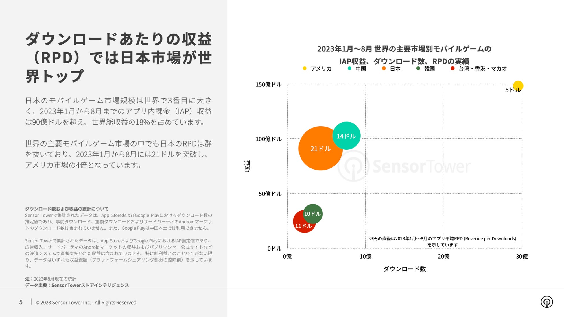 日本市場はモバイルゲームのダウンロードあたりの収益(RPD)が世界トップであり、アメリカ市場の4倍になっています。