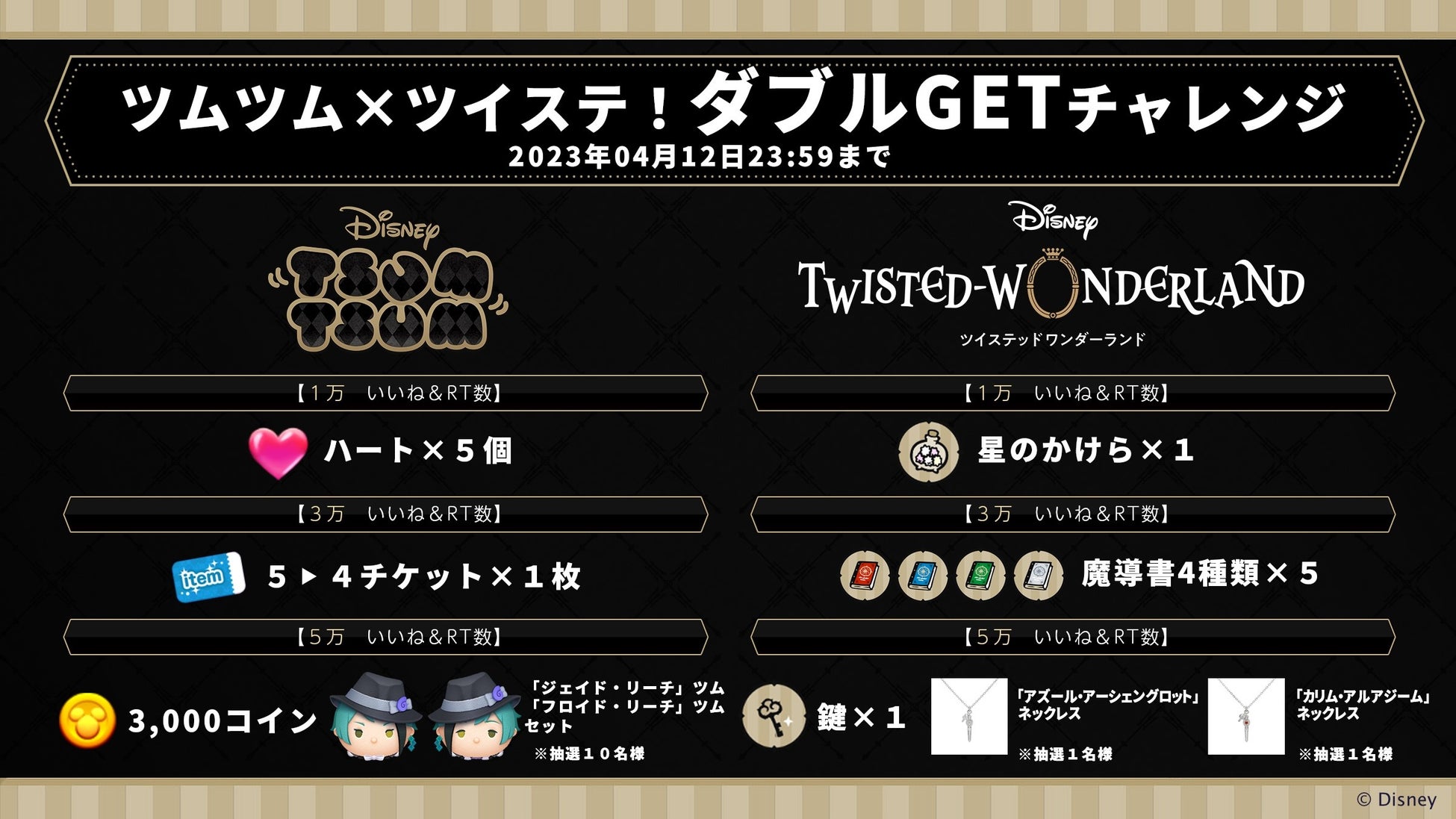 - LINEのディズニーツムツムとディズニーツイステッドワンダーランドが合同で「ツムツム×ツイステ!ダブルGETチャレンジ」を開催中