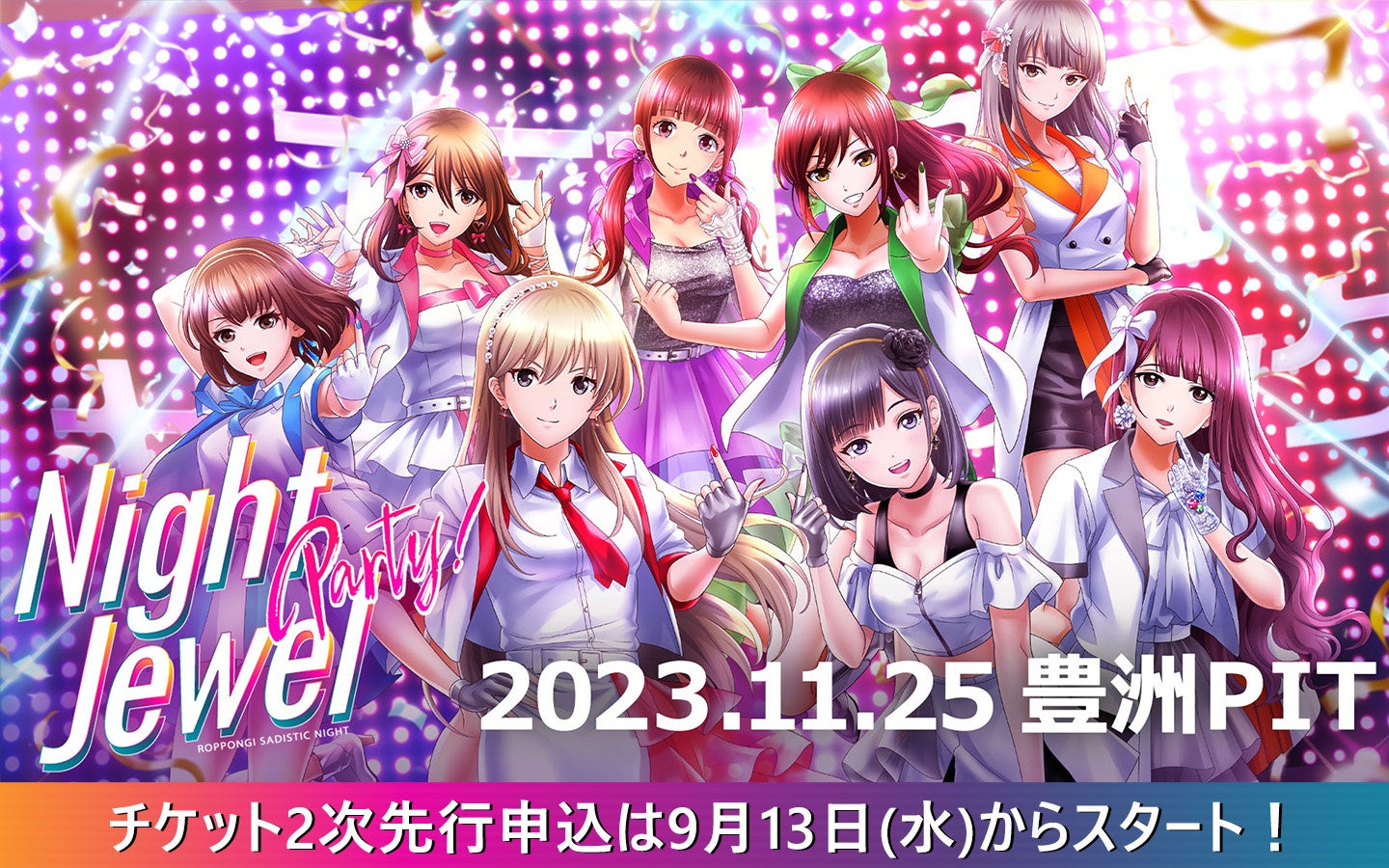 株式会社ボルテージは、11月25日(土)に豊洲PITで開催される「六本木サディスティックナイト」のライブイベント「Night Jewel Party!」のチケット2次先行申込の受付を開始しました。
