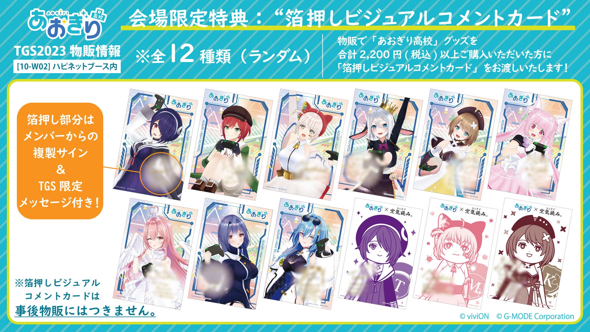 さらに、物販コーナーではあおぎり高校関連の新作グッズが販売され、特典として箔押しビジュアルコメントカードがプレゼントされます。