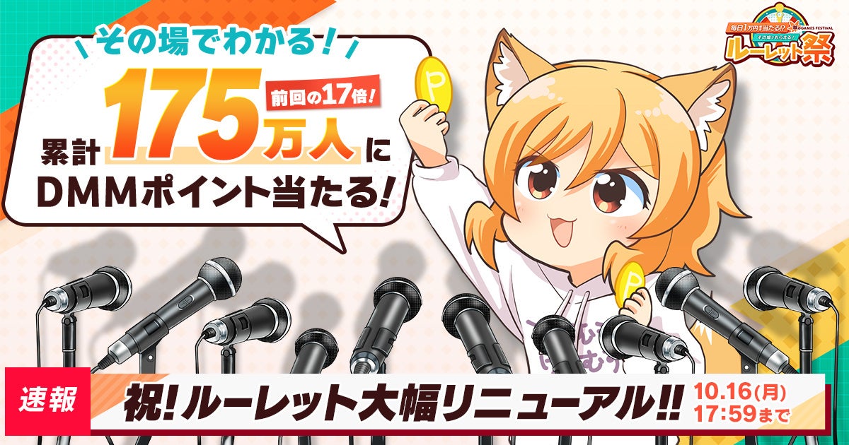 ルーレットを回すと最大10,000DMMポイントを獲得できるだけでなく、特設サイトへの訪問で現金100万円が当たるチャンスもあります。