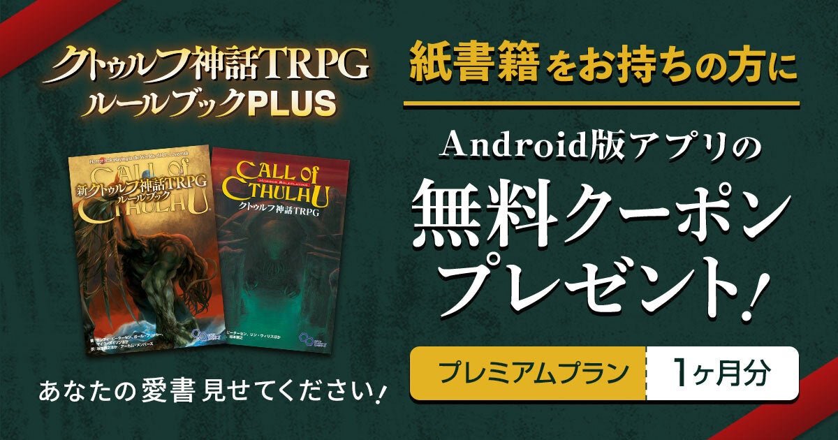 遂にAndroid版「クトゥルフ神話TRPG ルールブックPLUS」リリース!紙書籍ルールブックをお持ちの方に、1か月無料クーポンをプレゼントするキャンペーンも。