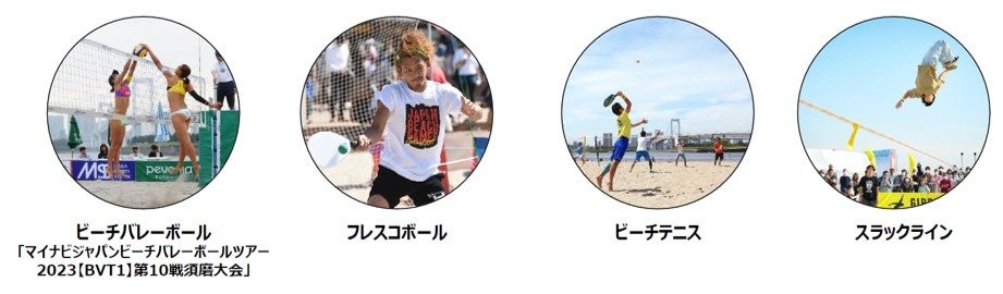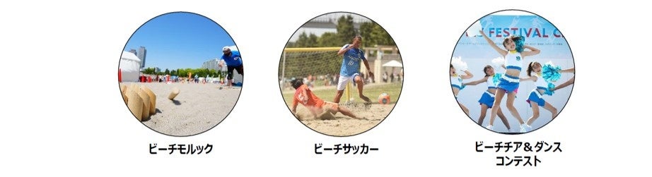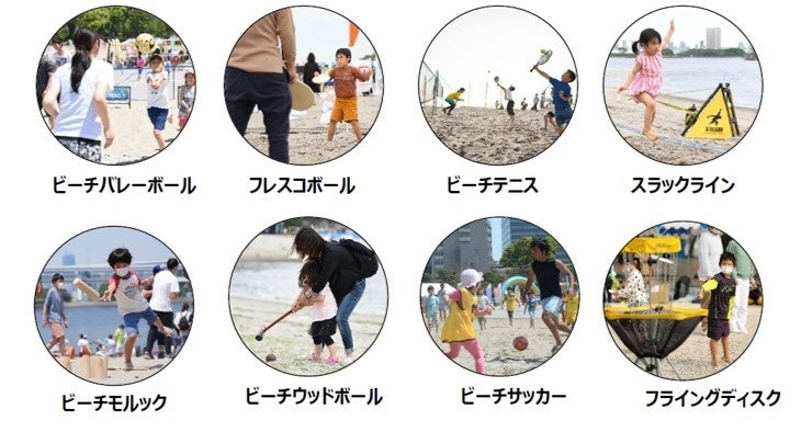 - ビーチバレーボール、ビーチテニス、ビーチサッカーなどの競技が行われる