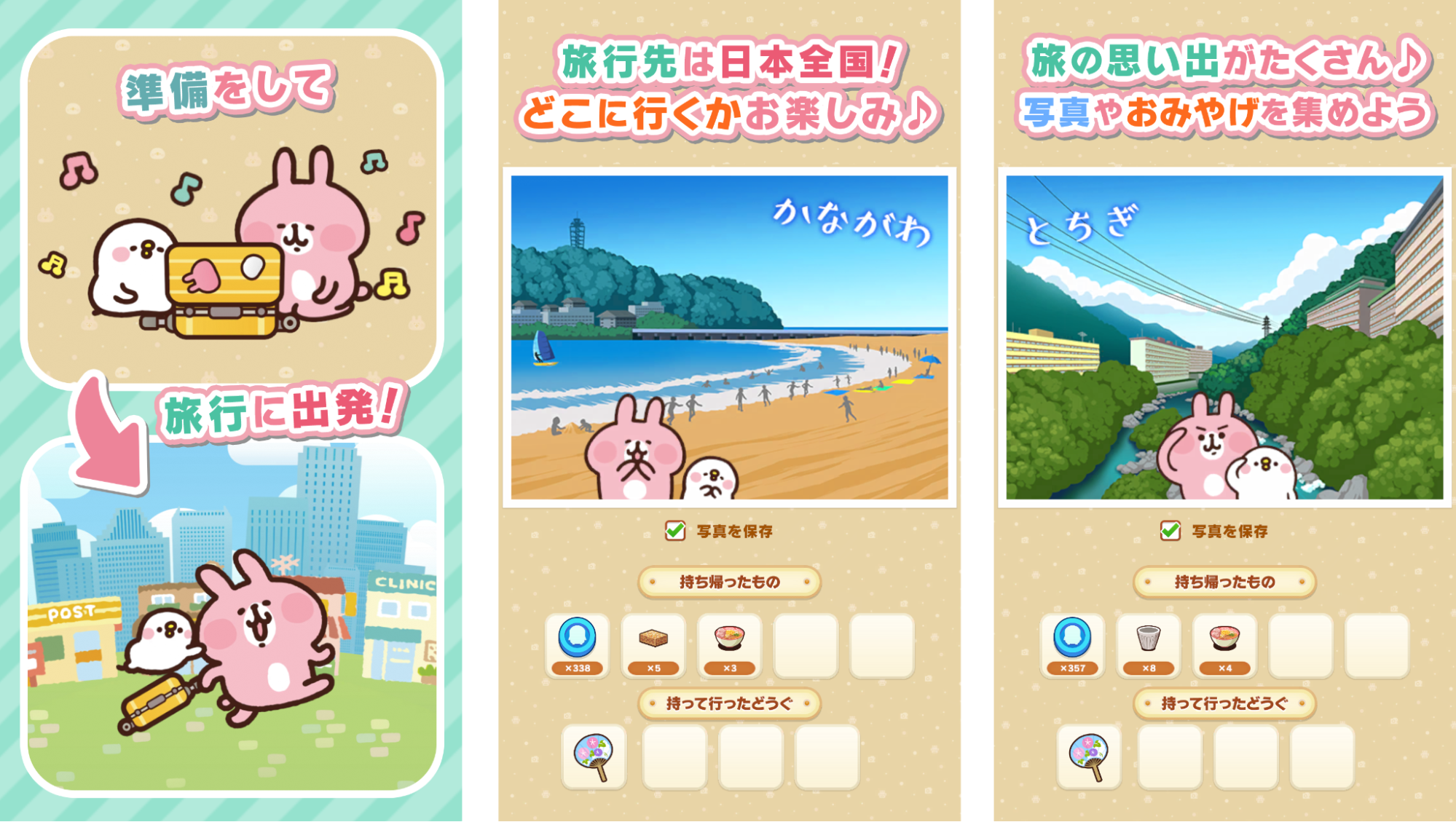 『カナヘイの小動物 ピスケ&うさぎの小旅行』は、放置ゲームで、ピスケとうさぎを旅行に行かせて帰ってくるのを待つ。