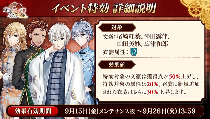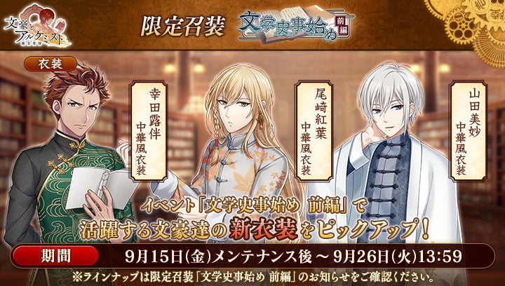 - DMM GAMESの「文豪とアルケミスト」でイベント『調査任務「文学史事始め 前編」』と限定召装『文学史事始め 前編』を開催中