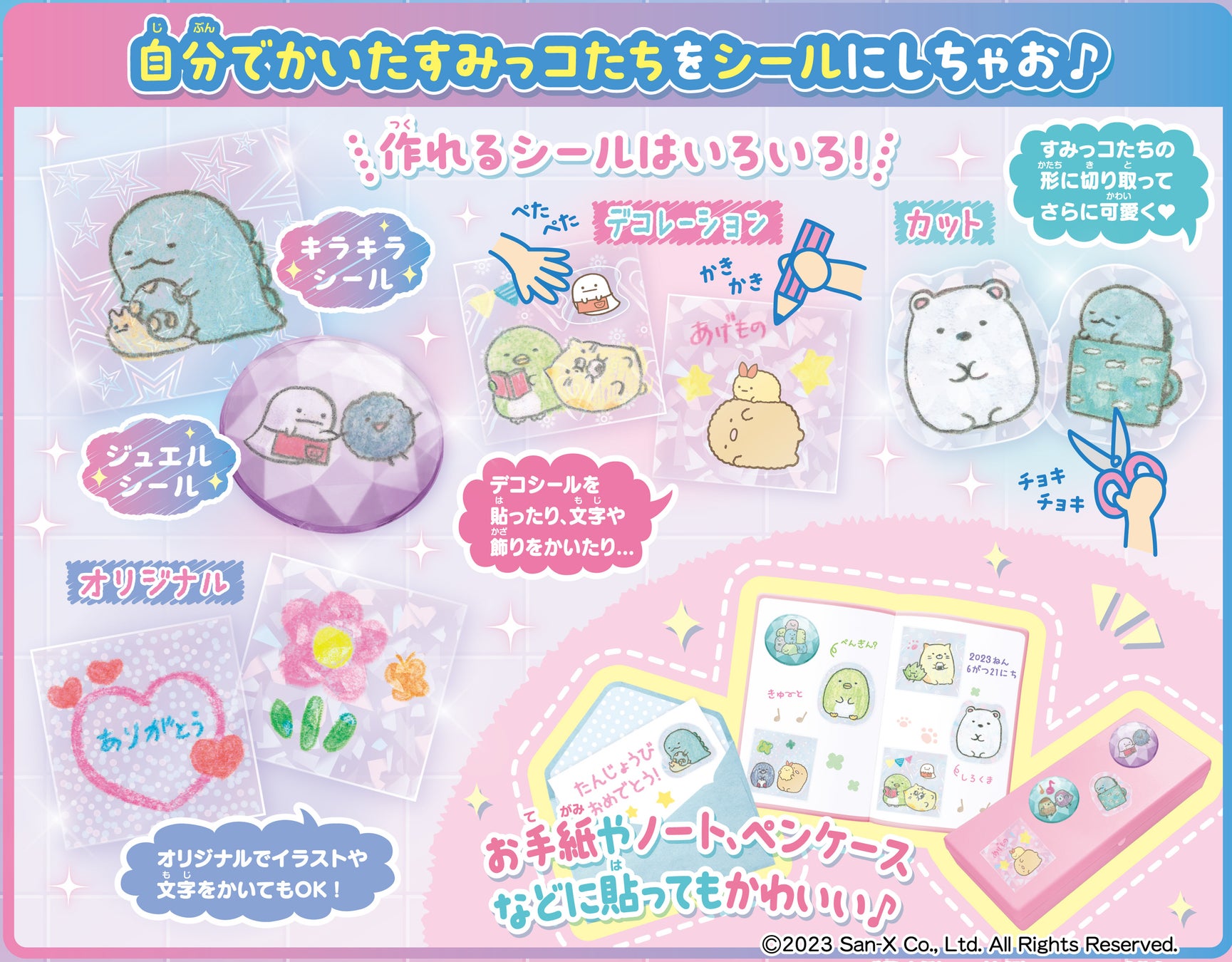 この商品は、自分で描いたすみっコぐらしのキャラクターでオリジナルシール作りが楽しめます。