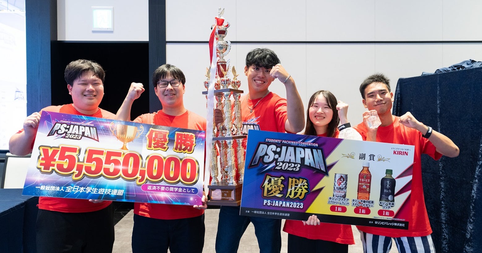 学生向けのパチンコ・パチスロ大会「PS:JAPAN 2023」の決勝大会が開催され、大阪在住の「沖縄に囚われた友達を助けに行く」チームが6,163ポイントを獲得し、初代チャンピオンに輝きました。