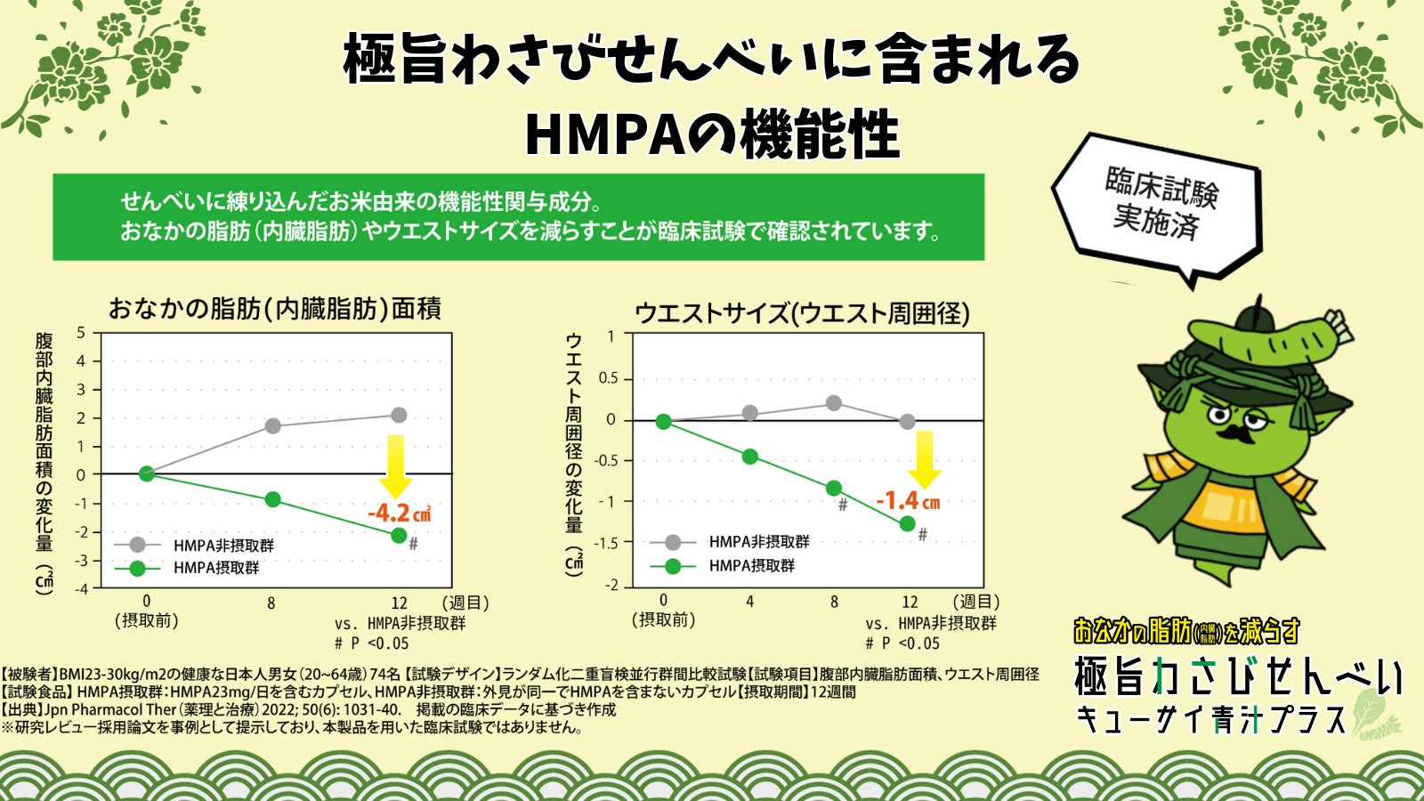 また、魔人せんべいは「おなかの脂肪を減らす極旨わさびせんべい キューサイ青汁プラス」という商品で、おなかの脂肪を減らす機能があります。
