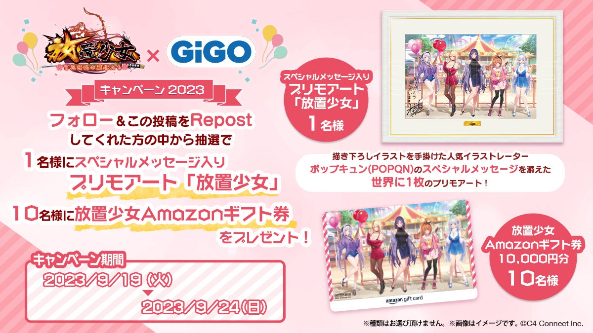C4 Connect株式会社は、美少女RPGゲーム『放置少女〜百花繚乱の萌姫たち〜』とGiGOグループのお店とのコラボキャンペーンを開始しました。