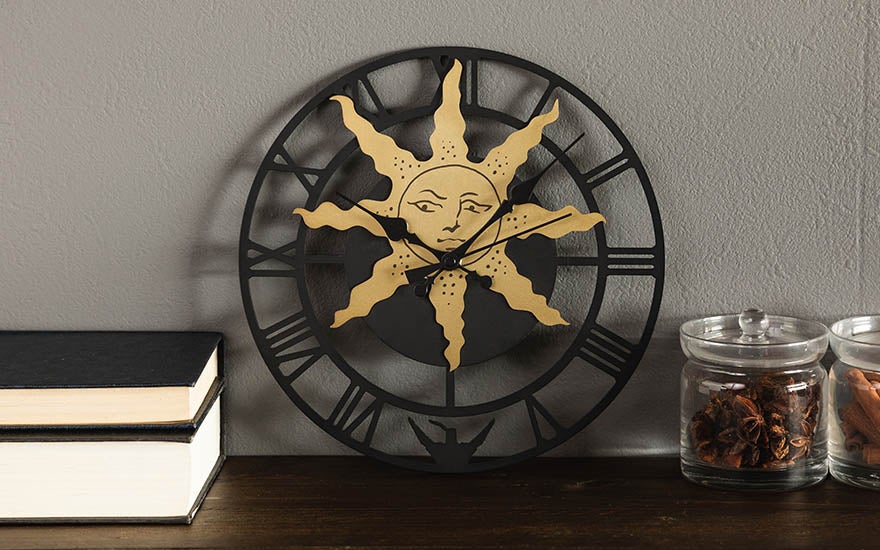 クロックは太陽を賛美する戦士をあしらったホーリーシンボルが輝くデザインで、壁掛け時計としても使用できます。