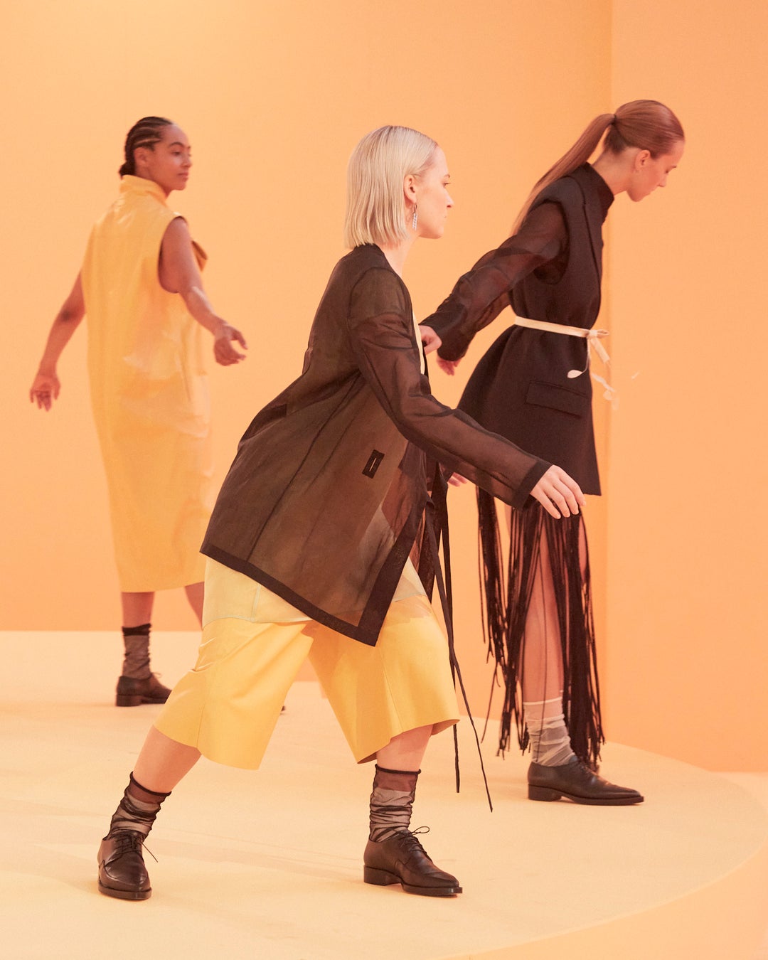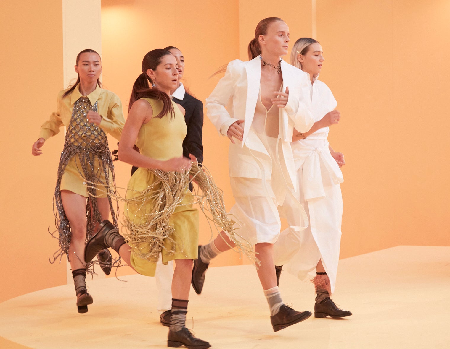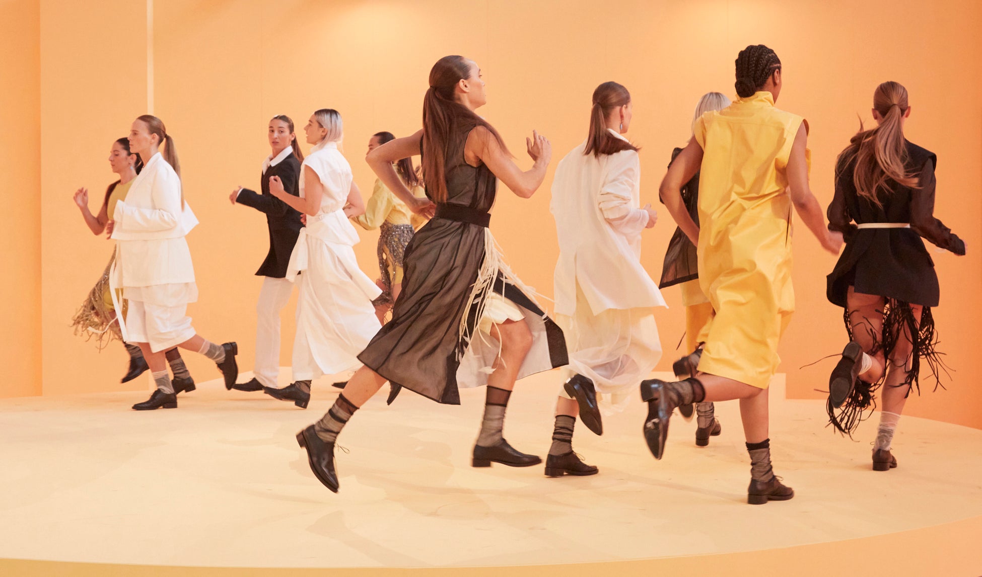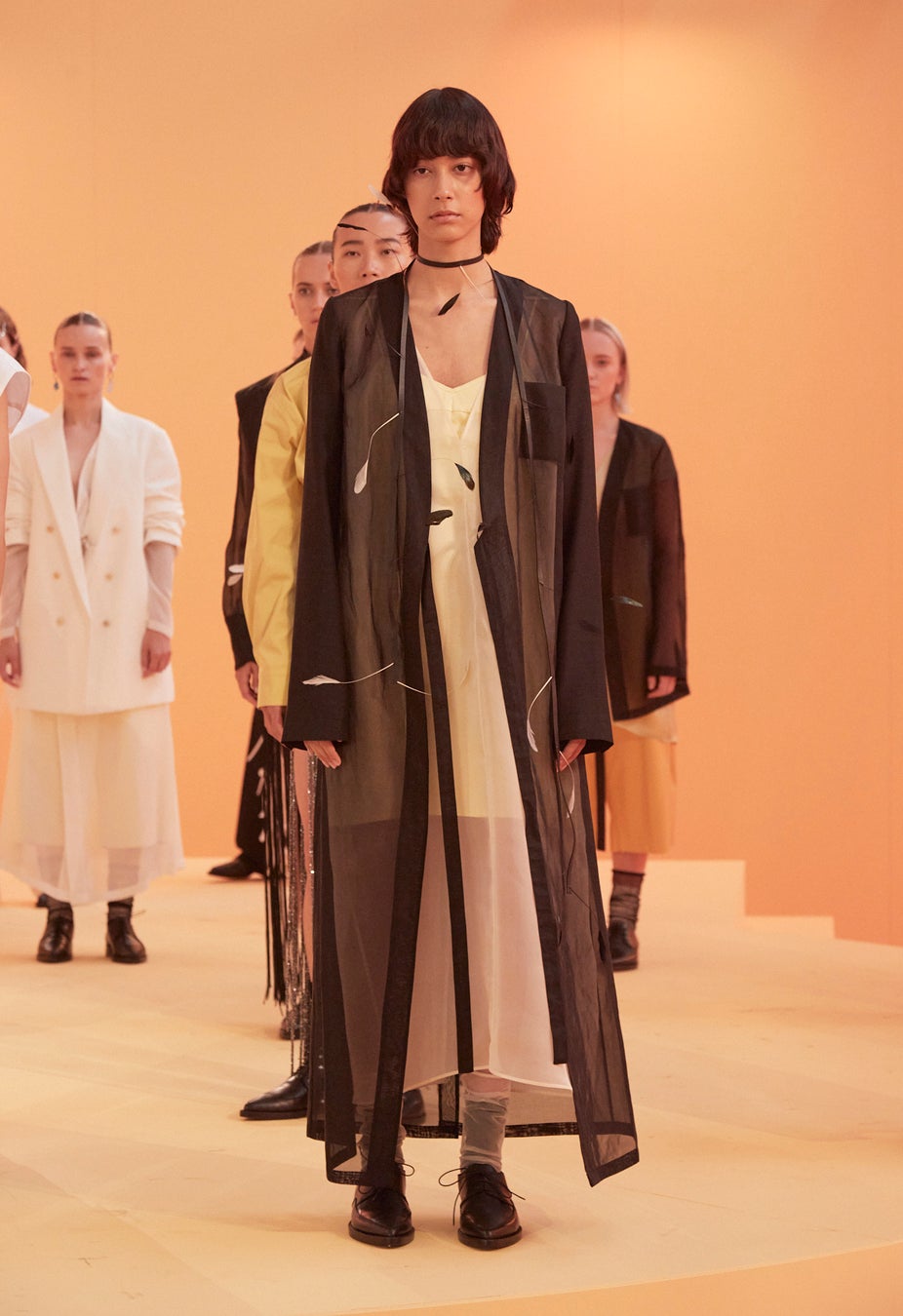 コレクションはダンサーとモデルのコラボレーションによる躍動的な動きが特徴で、震える羽や透明感のある色調が際立ちます。