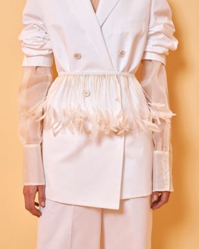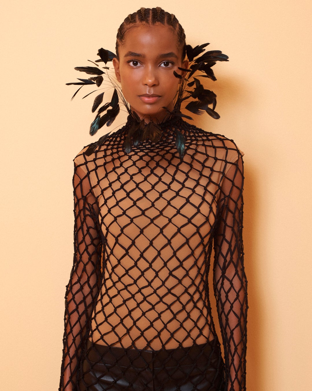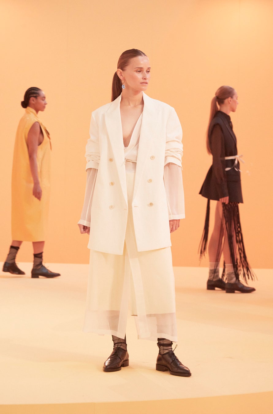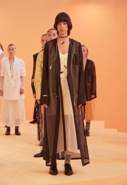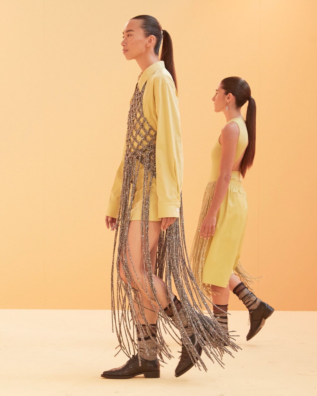 コレクションはダンサーとモデルのコラボレーションによる躍動的な動きが特徴で、震える羽や透明感のある色調が際立ちます。
