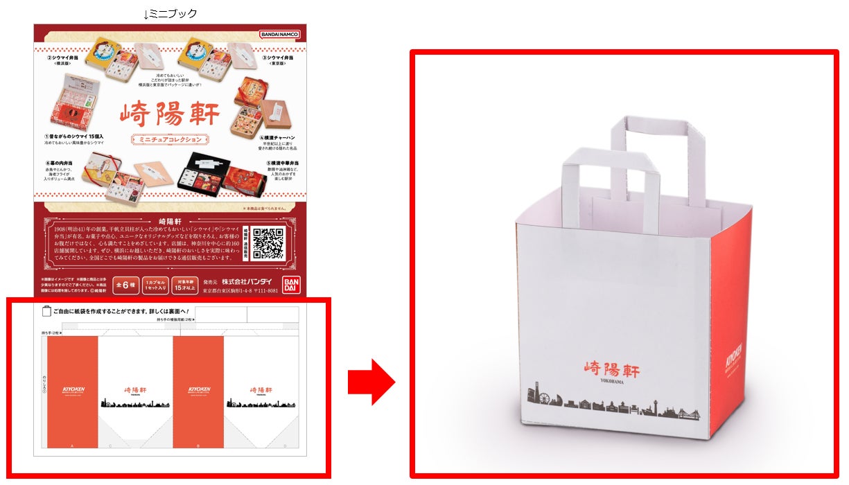 この商品は、シウマイやお弁当を再現したミニチュアフィギュアで、紙袋の展開図も付いています。