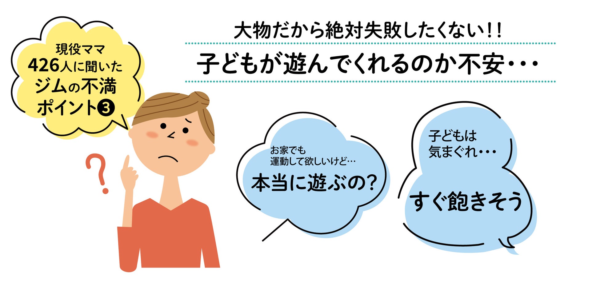 大型の遊具を購入することに抵抗がある理由として、子供の発達に合った商品がない、設置場所がない、子供が遊んでくれるか不安という理由がありました。