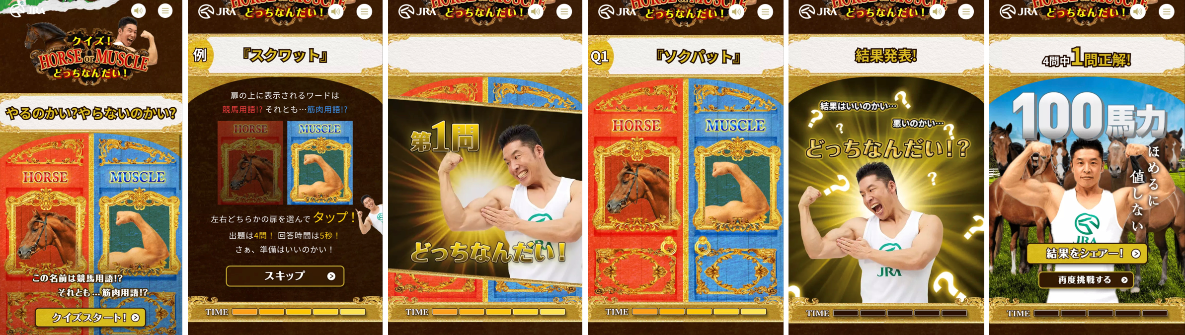 クイズは全4問で、問題はランダムで出題されます。全問正解する頃には、競馬に関する知識、そして筋肉にも詳しいパーフェクトな知識が身についているかも!?