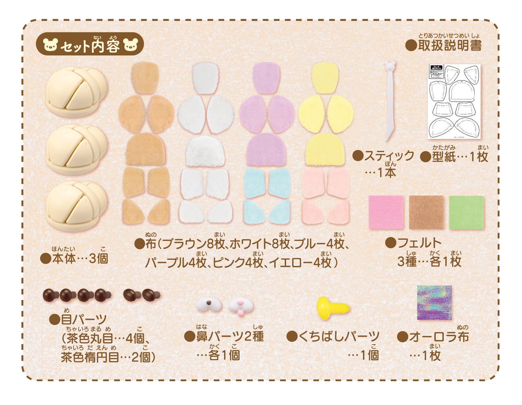 さらに、付属のフェルトやオーロラ布を使って耳やしっぽ、目や鼻、くちばしのパーツを自由に付けることができます。