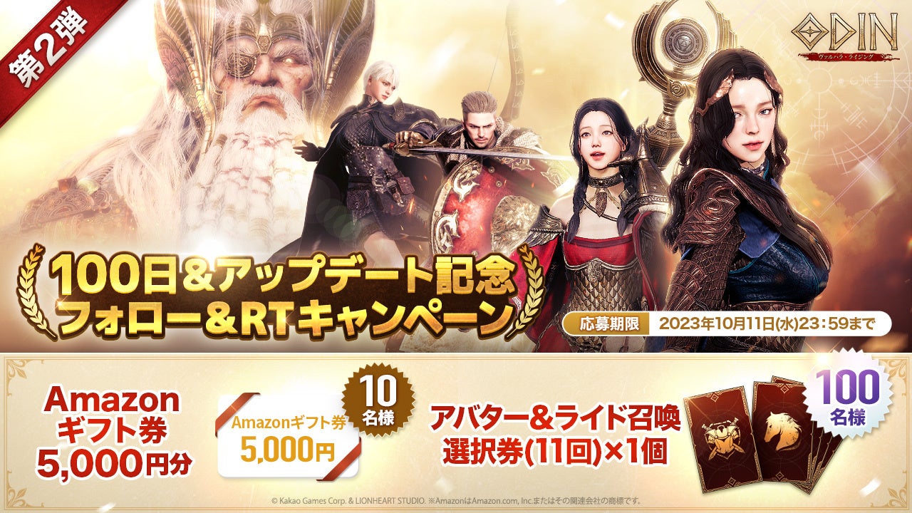 株式会社カカオゲームズは、北欧神話をテーマにしたオープンワールドRPG『オーディン:ヴァルハラ・ライジング』の正式サービス100日&アップデート記念キャンペーン第2弾を開催すると発表しました。