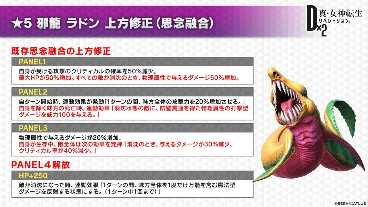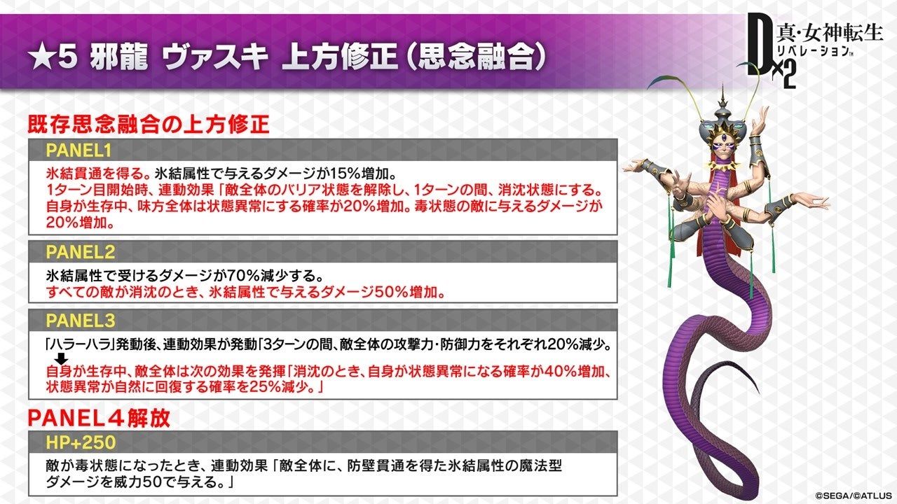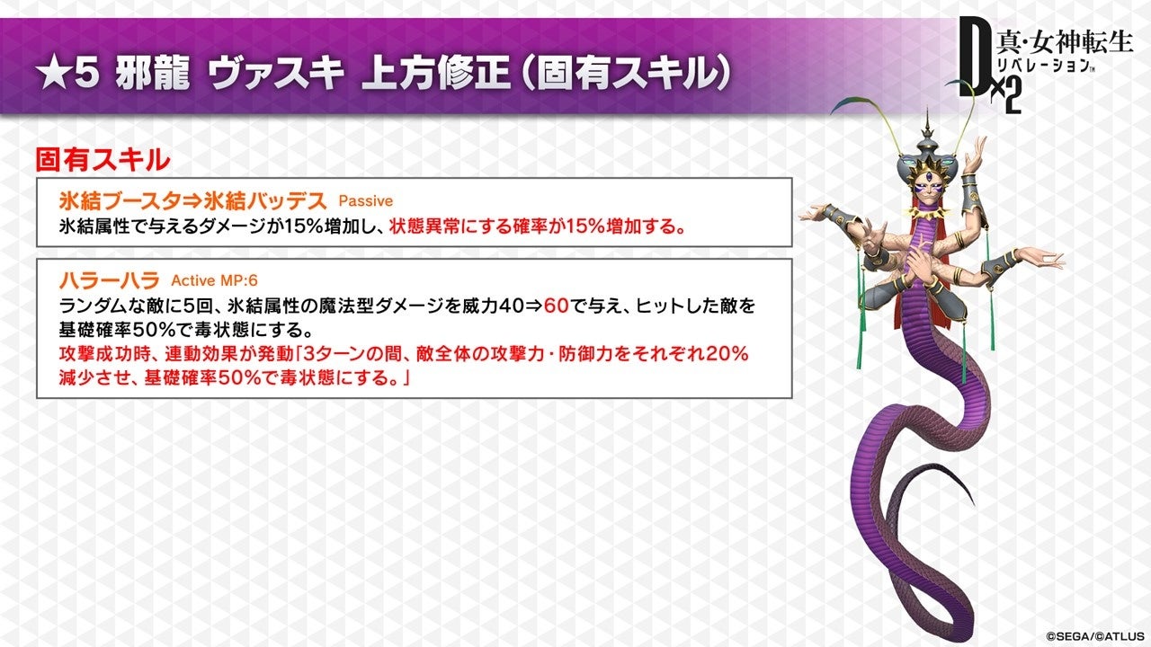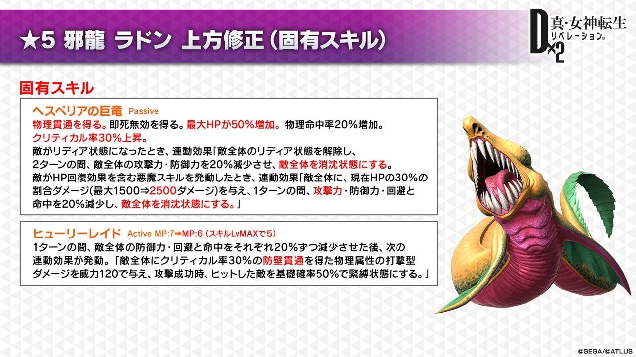 - D×2 真・女神転生リベレーション、龍王 ペンドラゴン、邪龍 ヴァスキ、邪龍 ラドン、邪神 エキドナ